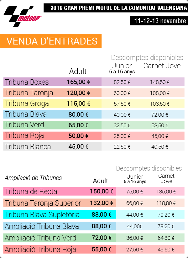 Gran Premio de Motociclismo de la Comunidad Valenciana El Circuito Ricardo Tormo de Cheste acoge el Gran Premio Motul de la Comunidad Valenciana de Moto GP, Moto 2 y Moto 3 del 11 al 13 de noviembre. ¿Cuándo? Fecha Del Friday, 11 de November del 2016 al Sunday, 13 de November del 2016 HORA 09:00 h ¿Dónde? LUGAR Cheste Cheste Ver ficha El Circuito Ricardo Tormo de Cheste acoge por 18º año el Gran Premio Motul de la Comunidad Valenciana centrado en motociclismo y en el que compiten las categorías de MotoGP, Moto2 y Moto3. Consulta toda la información sobre deporte en Valencia en nuestra agenda; si te preguntas qué hacer en Valencia este otoño, ¡acude a nosotros! Las entradas para el Gran Premio de Motociclismo de la Comunidad Valenciana se pueden consultar más abajo. Dependen de la ubicación de la tribuna y cuentan con diferentes descuentos. Además, conseguir entradas para este espectáculo te otorga beneficios en otros establecimientos, ya que el Bioparc, la Ciudad de las Artes y las Ciencias, Casino Cirsa y la Feria 2 Ruedas aplican descuentos en sus servicios a quien presente la entrada para el gran premio. Por primera vez en el Gran Premio Motul de la Comunitat Valenciana se han instalado 10 pantallas gigantes, para ofrecer a los aficionados la posibilidad de seguir íntegra la carrera desde todas las tribunas, ya que se han ubicado pantallas frente a todas las gradas. Programa de actividades en Cheste Viernes, 11 de noviembre 19:30h. CONCENTRACIÓN DE MOTEROS Gasolinera entrada pueblo. Recorrido hasta el Ayuntamiento 20:00h. BIENVENIDA A LA AFICIÓN Pl. Dr. Cajal. Por Champi Herreros 20:30h. VIDEOMAPPING Pl. Dr. Cajal. Espectáculo de imagen y sonido 21:00h. PAELLA GIGANTE Pl. Dr. Cajal. Degustación para los asistentes 21:30h. ACTUACIONES MUSICALES Ctra. de Liria. Tributo a Fito y Fitipaldi y DJ´s de actualidad 22:00 y 23:00h. VIDEOMAPPING Pl. Dr. Cajal. Espectáculo de imagen y sonido 22:00h. DERRAPADAS DRIFT SHOW Junto a báscula bodega. A cargo de Motodesguace Sábado, 12 de noviembre 11:00h. ENTRENAMIENTOS GP Pl. Dr. Cajal. Retransmisión pantalla gigante 19:00h. ACTUACIONES MUSICALES Ctra. de Liria. Tributo Pop 80-La Sede 2.0 y DJ´s de actualidad 22:00h. DERRAPADAS DRIFT SHOW Junto a báscula bodega. A cargo de Motodesguace Domingo, 13 de noviembre 11:00h. GP MOTOCICLISMO Pl. Dr. Cajal. Retransmisión pantalla gigante Ubicación de las tribunas Entradas Artículos relacionados Otoño Hacer deporte en Valencia