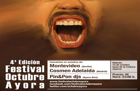 IV Festival Octubre Ayora en Valencia Un año más llega este festival de música en Ayora ¿Cuándo? Fecha Del Saturday, 13 de October del 2012 al Saturday, 13 de October del 2012 HORA 23:00 h ¿Dónde? LUGAR Ayora ayora Ver ficha Llega una nueva edición de este evento musical que se va a celebrar el próximo sábado 13 de octubre en Ayora (Valencia). Os presentamos los grupos participantes, que acudirán a Ayora en esta ocasión para realizar conciertos acústicos. Este año lamentablemente no se podrá celebrar el Octubre Mini, fiesta para los niños. Después del éxito que supusieron las ediciones del 2009, 2010 y 2011, en las que participaron Joaquín Pascual y Alondra Bentley en el 2009; AMA (en acústico), Fernando Alfaro y Tulsa, en el 2010, y Burrito Panza, Wiggum y Laboratorio Funk en el 2011, regresa un festival hecho con ilusión y pasión por la música. Así pues, el viernes 13 de octubre y en el Casa de la Cultura, podremos disfrutar de los directos de: Montevideo: Desde Sevilla nos llega la música de Alexis, Miguel, Manu y Damiana (en esta ocasión en formato trío), que traerán todas sus grandes melodías pop condensadas en 10 años de carrera. Acaban de publicar el que es su mejor trabajo, “El año del Dragón“. Cosmen Adelaida: Han convencido a propios y extraños con un LP debut, “7 Picos”, que colmaba las expectativas de aquellos que veían en el grupo madrileño una de las promesas más interesates del indie nacional. A Ayora nos traerán algunas de esas canciones en formato acústico. Pin&Pon djs: Tras los conciertos, disfrutaremos de la música que nos traerán dos de los djs más reconocidos de la escena independiente nacional, habituales en festivales y numerosas salas de nuestro país. (mejores djs nacionales en los últimos años para los lectores de la revista Rockdelux). Los conciertos comenzarán a las 23h y costarán tan sólo 4 euros. Artículos relacionados Música JAZZ en Valencia IVAM Jazz Festival 2012 Deleste Festival Valencia 2012 Concierto Fito y Fitipaldis en Valencia Concierto de Zahara en Valencia