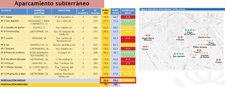 También se ha realizado una valoración del aparcamiento subterráneo. A través de un sistema de puntuación, se puntúan algunos parkings de la zona centro de Valencia.