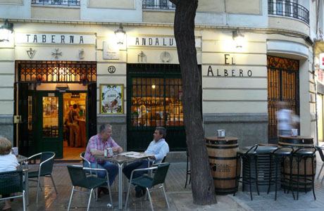 Bar Taberna El Albero La Taberna El Albero te acerca el tapeo andaluz a Valencia La Taberna El Albero es un viaje a Andalucía. Desde Valencia podrás degustar las variadas tapas de este local: gambitas blancas de Huelva, atún encebollado, tortilla de camarones, rabo de toro, pringá o lágrimas (trocitos de pollo empanado), entre otras muchas. Y para beber el típico fino o manzanilla. Decorado al estilo andaluz, los jueves, viernes y sábados se canta la Salve Rociera.