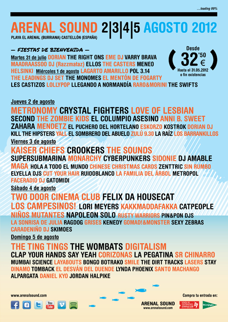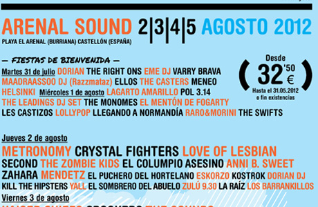Cartel Arenal Sound 2012 El cartel del Arenal Sound 2012 ya está cerrado El Arenal Sound 2012 ya tiene el cartel para sus cuatro días de festival. Consulta el cartel y compra tu entrada. Del 2 al 5 de agosto se celebra uno de los festivales más concurridos del verano. Playa, música y mucha diversión. Seguro que está tu grupo o cantante favorito. ¡Están todos!