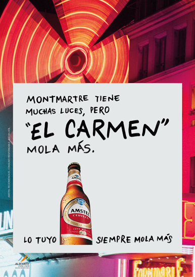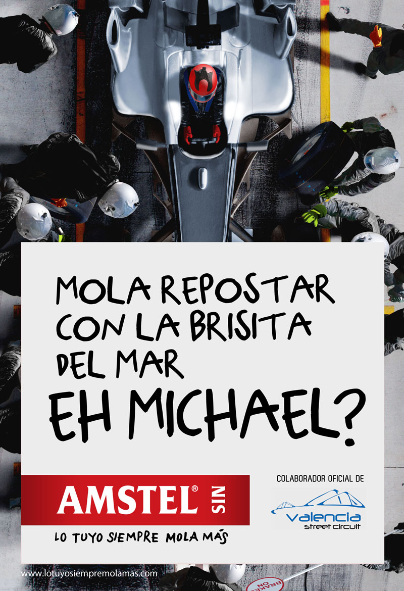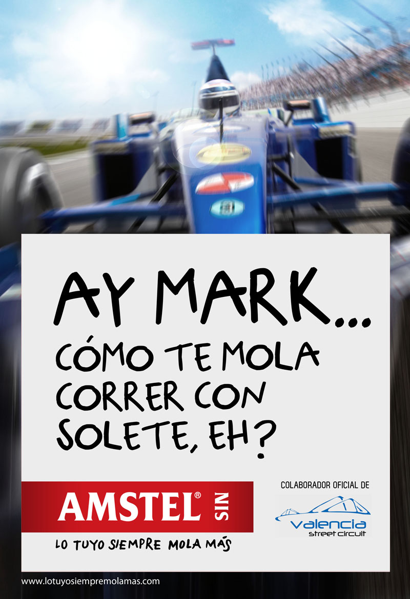 Los carteles Amstel en la Fórmula 1: “Lo tuyo siempre mola más” La original cartelería de Amstel hace alusión a las costumbres y cultura valenciana Asmtel estuvo en Valencia para disfrutar la Fórmula 1 y dejó una huella muy divertida. La marca de cerveza Amstel primero trajo el motor a las calles. Una parada en boxes por las calles de Valencia. Pero si hay que resaltar una campaña, en Love Valencia nos quedamos con las marquesinas y las alusiones directas a los pilotos de la Fórmula 1 Valencia 2011. Estos carteles forman parte de una campaña que se articula bajo el eslogan: “Lo tuyo siempre mola más”. Amstel ha conseguido una publicidad ligada a las costumbres y cultura valenciana, que gana la complicidad del ciudadano y una forma diferente de vender un producto.