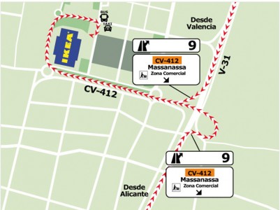 Cómo llegar a IKEA Valencia Conoce la forma más sencilla de llegar a IKEA Valencia La multinacional sueca abre sus puertas en Valencia el martes 17 de junio. Para que no faltes a este estreno te indicamos cómo llegar a IKEA Valencia. Las expectativas para la apertura de la tienda son muy favorables. Se espera que el día de la inauguración de IKEA Valencia, sea una jornada festiva, para celebrar con los clientes, en la que habrá conciertos, concursos y muchas sorpresas tanto en el interior como en el exterior de la tienda. IKEA Valencia se encuentra a unos 7 kilómetros de la ciudad y desde la tienda se ve la Albufera, el mar y la Ciudad de las Ciencias. Para que el desplazamiento a IKEA Valencia sea un éxito te damos las pautas de cómo llegar a IKEA Valencia de la forma más adecuada y fácil. IKEA Valencia se ubica en la Calle Alquería Nova, 12 46910 Alfafar, Valencia. Cómo llegar en coche Para llegar en coche a IKEA Valencia hay que tomar la Salida 9 de la V-31, hacia CV- 412 Massanassa/Zona Comercial Cómo llegar en Autobús Para llegar a IKEA Valencia en autobús, hay que coger la Línea 183, une el centro de Valencia con Alfafar. De lunes a domingo con una frecuencia de 30 minutos. Horarios y paradas. Cómo llegar en tren Para llegar a IKEA Valencia en tren se debe parar en: la Estación de cercanías de Alfafar. Horarios y paradas Horario de IKEA Valencia Te indicamos el horario de IKEA Valencia: De lunes a viernes de 10 a 22 horas Sábados, domingos y festivos autorizados de 10 a 22 horas *Horario del restaurante: de 9:30 a 21:30 horas.
