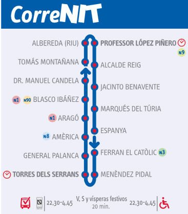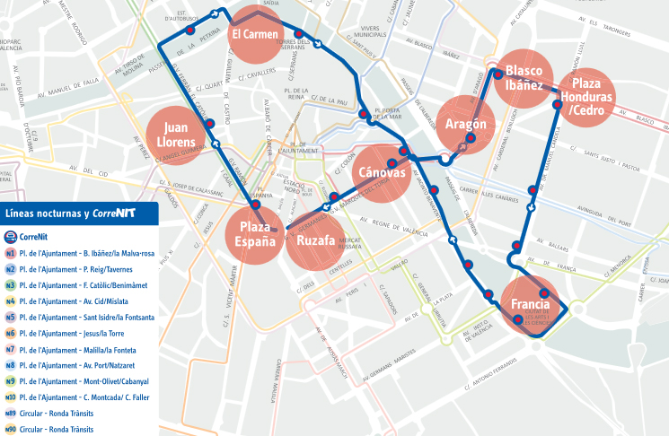 CorreNit, la línea de bus que recorre las zonas de fiesta de Valencia La línea de bus CorreNit pasa por las zonas de fiesta de Valencia los viernes, sábados y vísperas de festivos. 2017 – PARADA SUPRIMIDA Tras la prohibición de aparcar en el carril bus a partir del 15 de mayo de 2017, y el correspondiente refuerzo de las líneas nocturnas de las zonas más afectadas por la decisión, el Ayuntamiento de Valencia no ha creído conveniente proseguir con la actividad del CorreNit por ser una línea ”infrautilizada”. ______ La noche valenciana también va a tener su línea de bus. El CorreNit es una nueva línea de autobús que recorrerá las zonas de fiesta de Valencia por la noche desde el viernes 4 de octubre. El servicio se activará las noches de los viernes, sábados y vísperas de festivos desde las 22:30 y las 04:45 horas, con una frecuencia de paso de 20 minutos. El billete sencillo permitirá hasta un transbordo entre las líneas nocturnas. Recorrido del CorreNiT en Valencia Una alternativa de transporte público que hace un recorrido muy completo: Torres dels Serrans – Comte de Trénor General Palanca – Porta de la Mar (jardí) Pl. Amèrica – Gran Via marqués del Turia Av. Aragó – Xile Av. Blasco Ibáñez – Bèlgica Av. Dr. Manuel Candela (impar) – Av. Blasco Ibáñez Av. Dr. Manuel Candela (impar) – Av. Port Tomàs Montanyana – P. Albereda P. Albereda (riu) – Museu de les Ciències Av. Professor López Piñero – Museu de les Ciències Alcalde Reig (impar) – Pere Aleixandre Jacinto Benavente – Pont Àngel Custodi Gran Via Marqués del Túria (impar) – Cànovas Gran Via Marqués del Túria – Russafa Pl. Espanya – Ermita Gran Via Ferran el Catòlic – Juan de Mena Av. Menéndez Pidal – Estació d’autobusos (riu) Cánovas, Honduras, El Carmen, Aragón o Ruzafa son algunas de las zonas para salir que estarán comunicadas: