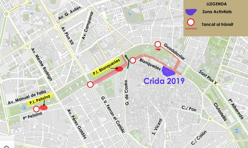 En la imagen inferior puedes consultar los cortes de tráfico en la Crida 2020. En las Torres de Serranos se cortará el tráfico a partir de las 16:45h en la Calle Guadalaviar en dirección a San Pío V, así como Pont de Fusta y la marginal derecha del antiguo cauce del río Turia desde G.V. Fernando el Católico hasta Conde de Trénor. También se cortarán los pasos inferiores de Pechina y Blanquerías.