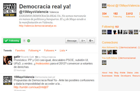 Democracia Real Ya en Valencia Los manifestantes que Democracia Real Ya se han estado reuniendo en la Plaza del Ayuntamiento La manifestación del 15-M también ha tenido eco en la ciudad de Valencia. Una revolución que comenzó en Twitter y que ha llegado a la calle, partiendo de hashtags (etiquetas que aglutinan información en twitter) como #nolesvotes, #democraciarealya o #acamapadavalencia. Tras la manifestación del domingo 15 de mayo, la respuesta social ha sido paulatina. Mientras el lunes y martes la participación fue moderada, conforme avanzaban los días, la Plaza del Ayuntamiento comenzó a ser un núcleo de propuestas y denuncias. De manera pacífica y dialogada, los jóvenes -y no tan jóvenes- se reunieron cada tarde en asambleas para pedir cambios. Una de las imágenes icónicas de este movimiento salió de la Plaza del Ayuntamiento. Un joven valenciano, Alejandro, de 19 años, cambió simbólicamente el nombre de la plaza por la de Quinze de Maig. Más información, aquí.