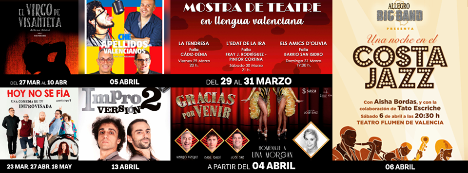 Día Mundial del Teatro en València Con motivo del Día Mundial del Teatro, 27 de marzo, los teatro valencianos ofrecen descuentos para disfrutar del arte Hoy, 27 de marzo, todos los teatros en Valencia se visten de gala para celebrar el Día Mundial del Teatro. Descubre más planes en nuestra agenda de eventos. Durante todo el fin de semana podrás disfrutar de una oferta muy variada de representaciones teatrales a precios muy económicos, ya que algunos teatros en Valencia realizan ofertas para que disfrutes con ellos del Día Mundial del Teatro. A continuación puedes consultar los descuentos que ofrecen los teatros en Valencia con motivo del Día Mundial de Teatro. Teatro Olympia El Teatro Olympia celebra el Día Mundial del Teatro con un 25% de descuento en cuatro obras que tienen lugar esta temporada en el teatro valenciano. La oferta esta disponible hasta el domingo 31 de marzo. Las obras de teatro con descuento son: La Culpa Del 28 de marzo al 7 de abril se presenta en el Teatro Olympia La Culpa de David Mamet. Un psiquiatra es requerido a declarar en favor de un paciente responsable de cometer una masacre. Cuando se niega a hacerlo, su carrera, su ética y sus creencias son cuestionadas, desencadenando una espiral de acontecimientos que convulsionará no sólo su vida, sino la de la persona que más quiere. 25% de descuento en las funciones de los días 28, 29 y 30 de marzo. Alta seducción Arturo Fernández y Carmen del Valle protagonizan esta divertida historia sobre el arte de la seducción del 10 de abril al 12 de mayo. ¿Qué es la seducción? ¿Un arte que quien lo posee lo exhibe casi involuntariamente? ¿Un don innato? ¿Una técnica aprendida? O ¿Se puede hacer de la seducción un modo de vida, una profesión? 25% de descuento en las funciones de los días 10, 11, 12, 13 y 14 de abril. Muerte en el Nilo Uno de los títulos más famosos de la extensa obra de Agatha Christie llega a Valencia del 16 al 26 de mayo. Muerte en el Nilo trata del asesinato de una joven rica durante un viaje en crucero por el Nilo, un asesinato frío y sin explicación aparente. Su protagonista es el célebre detective Hércules Poirot. 25% de descuento en las funciones de los días 16, 17, 18 y 19 de mayo. Sé infiel y no mires con quién Sé infiel y no mires con quién, la comedia que hizo reír a toda una generación y que se sigue representando en los teatros de todo el mundo llega al Teatro Olympia del 4 al 14 de julio en una nueva versión y dirección de Josema Yuste y con la coordinación general de Jaime Azpilicueta. 25% de descuento en las funciones de los días 4, 5, 6 y 7 de julio. Teatro Flumen El teatro Flumen lanza una promoción única con un descuento del 25% en todas sus obras. Solo durante el día de hoy, miércoles 27 de marzo, puedes adquirir tu entrada para cualquier día y función utilizando el código DIAMUNDIALDELTEATRO en la web del teatro Flumen. La programación incluye teatro, monólogos, musicales, zarzuelas y mucho más. De esta manera el teatro valenciano quiere dar las gracias a todos por formar parte de la familia flumen. Teatre Talia El teatro Talia se suma a la celebración de día del teatro 2019 con descuentos en algunas de las funciones que se realizarán en el teatro en los próximos meses. Si te gusta el teatro no dejes pasar esta oportunidad y compra tus entradas con descuento. La vida inventada de Godofredo Villa Del 4 al 7 de abril se representa en el teatre Talia La vida inventada de Godofredo Villa. En agosto de 2014, Godofredo tiene 89 años, ha sobrevivido a tres guerras y, sin embargo, se enfrenta al momento más difícil de su vida: recibir un gran homenaje con honores de estado. Desde la espera para recibir ese homenaje, Godofredo Villa recorre varios momentos de su memoria, que ha circulado por los acontecimientos de la Europa del siglo XX. 25% de descuento en todas las funciones. Mandíbula afilada El Talia acoge la obra Mandíbula afilada del 11 al 14 de abril con las interpretaciones de Jon Plazaola y Noemi Ruiz. El espectáculo trata sobre Juan y Laura y las dos formas de entender la vida, y de enfrentarse a ella. Juan y Laura son polos totalmente opuestos. Y, cómo no, se aman. 25% de descuento en todas las funciones. Una tienda en Paris Un espectáculo musical basado en el libro del escritor, periodista y presentador Màxim Huerta, que llega a Valencia del 2 al 12 de mayo. La obra transcurre entre los felices años 20 parisinos y la actualidad, uniendo las vidas de dos de sus protagonistas, Teresa y Alice. ¿Alguna vez has pensado en dejarlo todo y empezar de cero en otra ciudad? Sumérgete en esta historia y descúbrelo. 25% de descuento en las funciones de los días 2, 3, 4 y 5 de mayo. Aprovecha los descuentos que ofrecen los teatros en Valencia y disfruta del ocio en la ciudad.