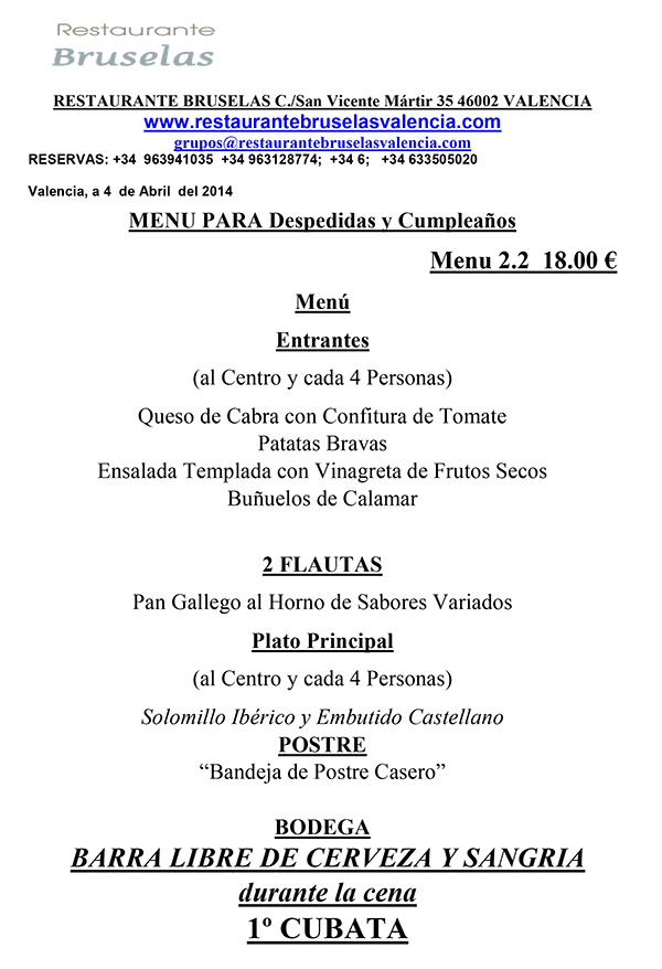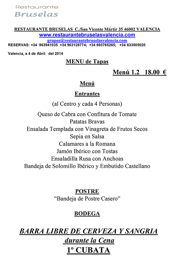 Disfruta de la bajada de precios del Restaurante Bruselas El Restaurante Bruselas, baja los precios en dos de sus menús Ahora que estamos en verano, apetece darse una vuelta por Valencia para descubrir un poco más la ciudad. Si no sabes dónde comer en Valencia y estás por el centro de de la ciudad prueba el Restaurante Bruselas, no te arrepentirás! El Restaurante Bruselas baja los precios de su menú de tapas y del menú para Despedidas y Cumpleaños, para que disfrutes de Valencia y de su gastronomía, con la mejor calidad-precio. Menú Despedidas y Cumpleaños Menú de Tapas El Restaurante Bruselas cuenta con más de veinte años de experiencia en hostelería y tienen todo tipo de platos, con sus arroces, ensaladas, pescados y carnes. Además es un sitio ideal para celebrar todo tipo de reuniones familiares o de empresa, con grandes salones y sus menús adaptados. El Restaurante Bruselas está situado en pleno centro de Valencia, en la calle San Vicente Mártir, 35, detrás del Ayuntamiento de Valencia. Para más información y reservas: [email protected] No dejes pasar la oportunidad de comer en Valencia a un precio inmejorable.