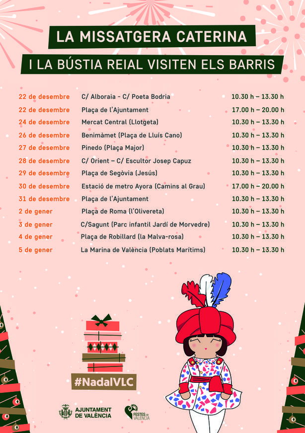 Dónde dejar tu carta a los Reyes Magos La mensajera Caterina recorrerá los barrios de València con el buzón real para asegurarse que todos los niños entreguen su carta a los Reyes Magos La Navidad en València cuenta con muchas tradiciones, y una de las más arraigadas es la Cabalgata de Reyes el 5 de enero. Melchor, Gaspar y Baltasar se desplazan hasta València para repartir los regalos entre los niños de la ciudad. Pero, ¿qué quieren los niños? ¿Cómo pueden los reyes saberlo? Muy sencillo. Este año la mensajera Caterina y sus ayudantes van a recorrer los barrios y pueblos de València con el buzón real para que todos los niños y niñas puedan depositar sus cartas y lleguen directamente a manos de los reyes. Consulta dónde estará el buzón real en los próximos días y llévate a los peques para que cumplan su ilusión: