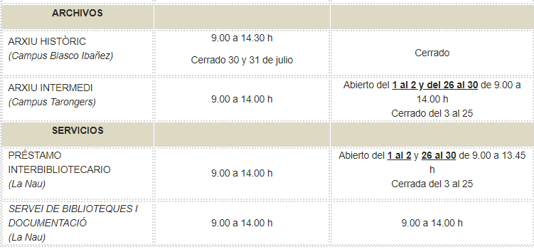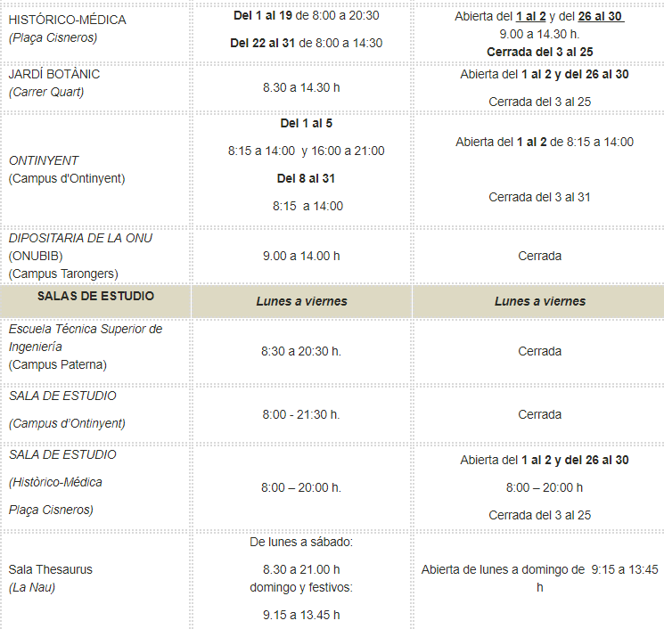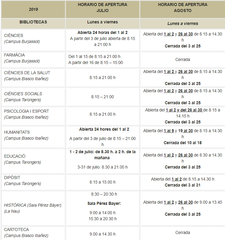 Dónde estudiar en verano en València Si tienes que estudiar en verano en Valencia, te presentamos una lista de bibliotecas abiertas en verano en las que puedes hacerlo Si tienes que estudiar en verano en València y te preguntas dónde puedes hacerlo, en la ciudad hay una oferta de bibliotecas abiertas en verano en Valencia de lo más variada. Así que si te toca estudiar este verano, aquí tienes toda la información. Puedes acudir a una de las bibliotecas municipales de València que mantiene este servicio durante el mes de agosto, como la Biblioteca Pública de Valencia, y también optar por las bibliotecas en valencia con horario de verano que se encuentran dentro de museos y centros culturales de la ciudad. El MuVIM es un ejemplo de ello. Otra opción muy interesante para estudiar en verano en Valencia, es ir a una Bibliomar, se trata de bibliotecas que se encuentran disponibles en tres playas de Valencia: Malvarrosa, El Cabañal y Pinedo. Para más información consulta bibliotecas en las playas de Valencia. Te presentamos una lista de la bibliotecas donde estudiar en verano en Valencia, con el correspondiente horario de verano de las bibliotecas en Valencia y todas ellas con las mejores condiciones (WiFi, aire acondicionado) para que estudiar sea más llevadero. Apunta todas las bibliotecas que estarán abiertas este verano en Valencia. Bibliotecas públicas Biblioteca pública de Valencia Dirección: Calle Hospital, 13. Zona centro Horario: Julio: lunes a viernes de 9:00h a 15:00h. / Agosto: lunes a viernes de 9:00h. a 14:00h. Cómo llegar Autobús: líneas 5, 13, 27, 60 y 81 Metro: estación Àngel Guimerà, líneas 1, 3 y 5 WiFi: Sí Aire acondicionado: Sí Biblioteca de Humanidades Joan Reglà Dirección: C/ Artes Gráficas, 13. Zona Blasco Ibáñez Horario: Julio: lunes a viernes de 8:15h a 21:00h Agosto: 8:15h a 14:30h (cerrada del 12 al 20) Cómo llegar: Autobús: líneas 9, 12, 29, 30, 40, 41, 71, 79, 80 y 81 Metro: estación Facultades, líneas 3 y 9. WiFi: Sí. Necesitas ser estudiante de la Universidad de Valencia para conectarte a la red. En caso contrario, la Biblioteca de Humanidades Joan Reglà dispone de ordenadores que los usuarios externos a la universidad pueden usar para conectarse Aire acondicionado: Sí Espacios para estudiar en verano IVAM Dirección: C/ Guillem de Castro, 118 Horario: Lunes a Viernes de 10:00 a 15:00 horas. AGOSTO CERRADO. Cómo llegar: Autobús: líneas 5 (parada en la puerta del museo), 8, 28, 29, 79, 80, 81, 85. Metro: Estación Turia, línea 1. WiFi: Sí Aire acondicionado: Sí Observaciones:Los lunes: por la puerta lateral (calle entre el IVAM y el Centro de la Beneficencia) De martes a viernes, por acceso principal del IVAM. MuVIM Dirección: Calle de Quevedo, 10. Horario: Julio y agosto de 9:00 a 14:00 Cómo llegar: Autobús: líneas 5, 60 y 62 (por la calle Guillem de Castro) y 9, 11, 27, 61 y 71 (por la Calle Quevedo) Metro: estación Xàtiva o Àngel Guimerà, líneas 3 y 5. Estación Plaça d’Espanya, línea 1. WiFi: Sí Aire acondicionado: Sí La Nau Dirección: Calle de la Universidad, 2. Horario: Julio: De lunes a sábado: 8.30 a 21.00 h / Domingo y festivos: 9.15 a 13.45 h Agosto: Abierta de lunes a domingo de 9:15 a 13:45 h Cómo llegar: Autobús: líneas 4, 6, 8, 9, 10, 11, 16, 26, 28, 31, 32, 70, 71 y 81 Metro: estación Colón, líneas 3, 5, 7 y 9 WiFi: Sí. Necesitas ser estudiante de la Universidad de Valencia para conectarte a la red. En caso contrario, La Nau dispone de ordenadores que los usuarios externos a la universidad pueden usar para conectarse Aire acondicionado: Sí Observaciones: Hay que buscar la Sala Thesaurus, ubicada en el primer piso del centro cultural La Nau, y habilitada para estudiar y para trabajos en grupo. Museu Valencià d’Etnologia Dirección: C/ Corona, 36 Horario: De 09:00 a 14:00. Cómo llegar: Autobús: líneas 5 y 95. Metro: estación Àngel Guimerà, líneas 3 y 5. Estación Plaça d’Espanya, línea 1. WiFi: Sí Aire acondicionado: Sí Observaciones: el Museu Valencià d’Etnologia se encuentra dentro del Centro Cultural La Beneficència Más info: Red de Bibliotecas Públicas Municipales Horario: Lunes a viernes de 8.45 a 14.45 horas. Abiertas en Agosto: Lluís Fullana i Mira (Maguncia), Joaquim Martí i Gadea (Fonteta), María Moliner (Serpis), María Beneyto (Torres Quart), Joan de Timoneda (Beniferri), Isabel de Villena (Torrefiel), Casa de la Reina (Cabanyal-Canyamelar), Clara Santiró i Font (Sant Marcel.lí) y Vivers (Trinitat). Biblioteca Municipal Azorín Dirección: C/ AZAGADOR DE LAS MONJAS, S/N. Zona Patraix Cómo llegar: Autobús: líneas 11, 9, 71 Tranvía: línea 1/2 WiFi: Sí Aire acondicionado: Sí Biblioteca Municipal Carles Ros Dirección: CASA VESTUARIO – PLAZA DE LA VIRGEN, 1. Zona Ciutat Vella/ La Seu Cómo llegar: Autobús: líneas 80 Tranvía: línea 3,5,9 (parada Colón) WiFi: Sí Aire acondicionado: Sí Biblioteca Municipal Carmelina Sánchez-Cutillas Dirección: C/ Poeta Serrano Clavero, 40. Zona Benicalap Cómo llegar: Autobús: líneas 12, 64 Tranvía: línea 4 WiFi: Sí Aire acondicionado: Sí Biblioteca Municipal Carola Reig Salvá Dirección: C/ Francisco Martínez, 32 y 34. Zona Benimámet Cómo llegar: Autobús: líneas 12, 70 Tranvía: líneas 4 y 6 Metro: líneas 3 y 9 WiFi: Sí Aire acondicionado: Sí Biblioteca Municipal Casa de la Reina Dirección: C/ Reina, 85. Zona Cabanyal Cómo llegar: Autobús: líneas 19, 2 y 32 Tranvía: línea 6 WiFi: Sí Aire acondicionado: Sí Biblioteca Municipal Clara Santiró i Font Dirección: C/ Pío IX, 2. Zona La Rambleta Cómo llegar: Autobús: líneas 10, 9, 23 WiFi: Sí Aire acondicionado: Sí Biblioteca Municipal Constantí Llombart Dirección: C/ Doctor J.J. Dómine, 19. Zona Playa (El Grau) Cómo llegar: Autobús: líneas 2, 4, 19, 20 y 30 Tranvía: estación Grau – Canyamelar, líneas 5, 6 y 9 WiFi: Sí Aire acondicionado: Sí Biblioteca Municipal de la Petxina Dirección: C/ Petxina, 42. Zona Ext