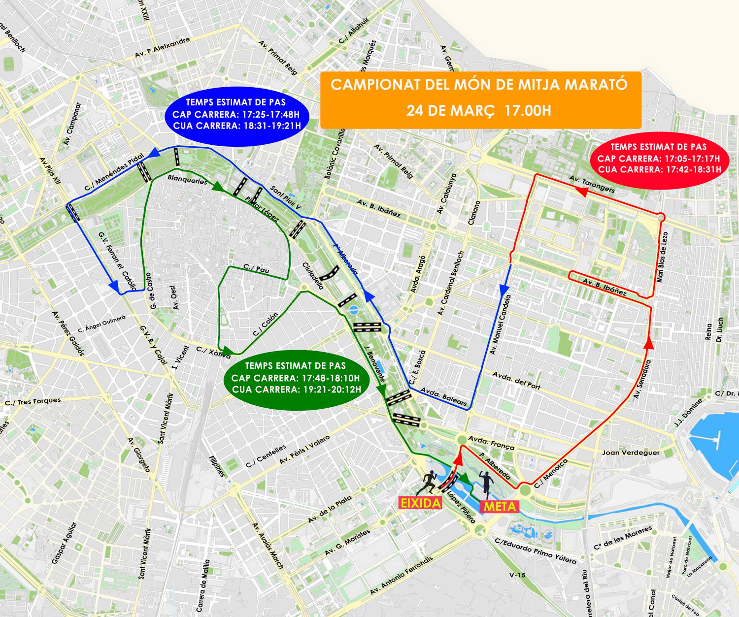 El Mundial de Medio Maraton en Valencia El Mundial de Medio Maraton llega a Valencia en 2018 Valencia se consolida como ciudad del running. La 23ª edición del Campeonato del Mundo de Medio Maratón se celebrará en Valencia el sábado 24 de marzo de 2018. La IAAF, la Asociación Internacional de Federaciones de Atletismo, anunció en Mónaco la elección definitiva de Valencia como sede del evento deportivo, quedando por delante de otras candidaturas mundiales como Toronto o Lima. El campeonato del mundo de Medio Maratón se celebrará por segunda vez en su historia en territorio español, pues en 1996 se celebró la 5ª edición del evento en Palma de Mallorca. En 2018, Valencia reunirá a un grupo de 300 corredores entre los que estarán los más rápidos del planeta. No obstante, el evento también estará enfocado para que corredores provinientes de distintas partes del mundo puedan disfrutar de la carrera por las calles de Valencia. Es importante aclarar que la elección de Valencia como ciudad organizadora del Mundial de Medio Maratón no reemplazará al Medio Maratón Valencia Trinidad Alfonso, que se celebrará el 28 octubre. Valencia se afianza como ciudad del running en España, pues es la única ciudad de toda España que alberga dos competiciones que tienen la máxima distinción internacional en su ámbito. Tanto el Medio Maratón como el Maratón Valencia Trinidad Alfonso han sido galardonados por la IAAF con la máxima categoría: la Label Race Gold. Figurando, ambas pruebas, en el calendario oficial de carreras con Etiqueta de Oro de la IAAF. Horarios y recorrido Mundial Medio Maratón La salida de la élite femenina, compuesta por las atletas seleccionadas por sus respectivos países, será a las 17:05 horas de la tarde. Mientras que los atletas de élite masculina saldrán exactamente 25 minutos después, a las 17:30 horas. A la misma hora (17:30h) saldrán los hombres y mujeres que participan en la Mass Race, carrera popular, que tengan marca inferior a 1:55:00, y a las 17:40 los atletas populares con marca superior a 1:55:00. Calles cortadas Mundial Medio Maratón en Valencia 2018 Si vas a animar los runners el sábado 24 de marzo, o vas moverte por València en coche o en transporte público, esta información sobre las calles cortadas durante el Mundia Medio Maratón pueden serte útiles.