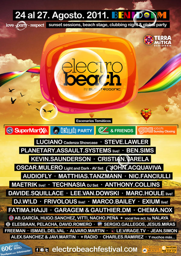 Electrobeach Festival 2011 El Electrobeach Festival 2011 se celebra del 24 al 27 de agosto en Benidorm El Electrobeach Festival 2011 se celebra del 24 al 27 de agosto en Benidorm. La segunda edición de un festival que se convierte en punto de encuentro de la música electrónica. Un amplio cartel para los diferentes escenarios del Electrobeach Festival 2011: Luciano; Oscar Mulero; Ben Sims; Cristian Varela; Marc Houle; Steve Lawler; Technasia; Marco Bailey; Kevin Saunderson; Matthias Tanzmann; entre otros muchos.