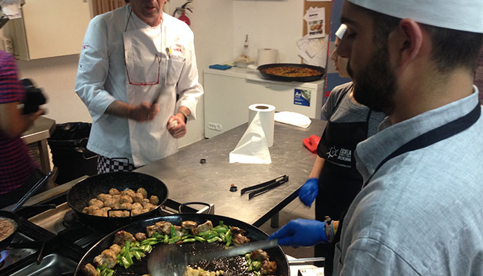 Con todos los ingredientes, ya nos dirigimos a la escuela donde el Chef Benny de la Escuela de Arroces y Paella Valenciana nos indicaría paso por paso cómo elaborar la paella. Ya con gorro y delantal, nos puso en situación mientras observábamos con un poco de recelo los fogones, y nos acompañó a dar un paseo por la historia de la paella valenciana y sus diferentes recetas para así poder hacerla con conocimiento e interés. Con guantes, manoplas y todos los artilugios necesarios para no tener ningún percance durante el proceso, nos pusimos manos a la obra con esta joya de la gastronomía de Valencia.