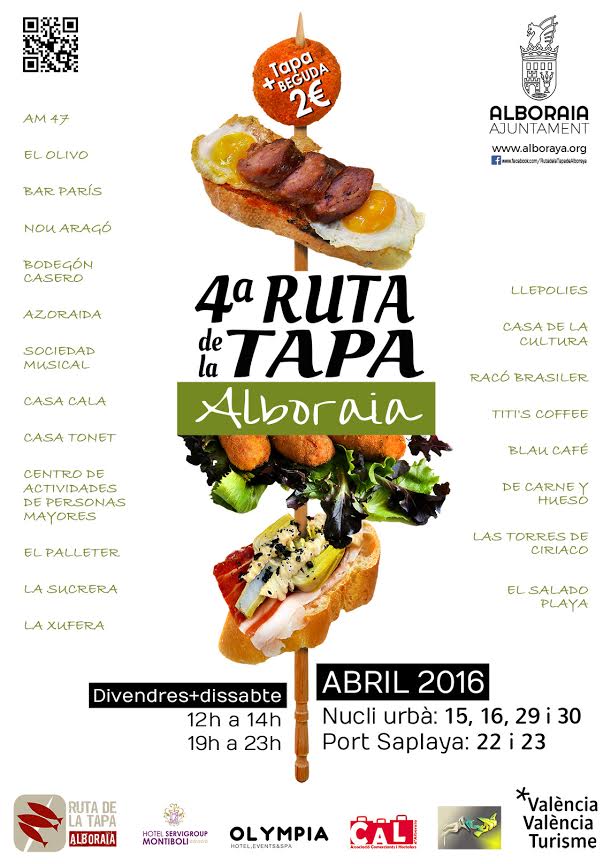 Esta ruta gastronómica en Alboraya celebra su cuarta edición durante los días 15, 16, 22, 23, 29 y 30 de abril. Durante estos días, 21 establecimientos de Alboraya y Port Saplaya. Los horarios para disfrutar de esta iniciativa son de 12:00h a 14:00h y de 19:00h a 23:00h. Durante el primer y último fin de semana la Ruta de la Tapa se circunscribe al núcleo urbano de Alboraya, y el fin de semana del 22 y 23 de abril la oferta se traslada a Port Saplaya.