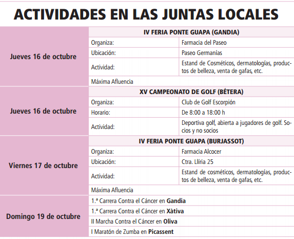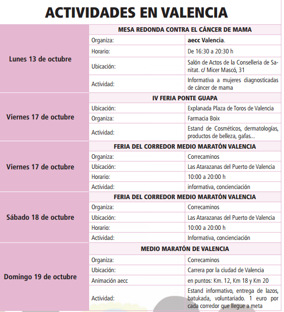 Actividades Día Mundial contra el Cáncer de Mama en Valencia Valencia celebra con numerosos actos el Día Mundial Contra el Cáncer de Mama 2014 ¿Cuándo? Fecha Del Monday, 13 de October del 2014 al Sunday, 19 de October del 2014 HORA 01:00 h ¿Dónde? LUGAR Valencia Valencia Ver ficha El domingo 19 de octubre se celebra el Día Mundial contra el Cáncer de Mama, con motivo de esta fecha Valencia celebra diversas actividades y actos para recordar y dar visibilidad al compromiso de toda la sociedad en la lucha contra el cáncer de mama. Consulta todos los eventos de Valencia. Actividades en Valencia Media Maratón El Día Mundial de Cáncer de Mama, domingo 19 de octubre, se celebra el 24º Medio Maratón Valencia Trinidad Alfonso, en la que más de 8.000 runners participarán por una buena causa: la Asociación Española contra el Cáncer de Valencia (AECC Valencia), ya que este año son la entidad solidaria de una de las citas más importantes del panorama nacional e internacional de atletismo. Con lo cual, por cada corredor que llegue a la meta se destinará un euro a aecc Valencia. Con el fin de que deporte y solidaridad vayan de la mano están enviando consejos de salud a los participantes de la carrera a través de la Web de la organización. Incluso estarán presentes con una Unidad Móvil en la Feria del Corredor los días previos al Medio Maratón. En el ÚLTIMO KILÓMETRO del recorrido (km. 20), se disfrutará de una jornada lúdica y social con animadas actividades para runners y el público en general. Entre ellas, una batukada y un lazo rosa gigante con el que llegaremos juntos hasta la meta. El objetivo: convertir este reto deportivo en una oportunidad para lograr otro récord: el de la solidaridad ciudadana y el compromiso con la lucha contra el cáncer. Asociación Española Contra el Cáncer Desde la Asociación Española Contra el Cáncer te invitan a sumarte a la lucha contra el cáncer de mama, colaborando con la compra de unas gafas polarizadas. Puedes comprarlas en sus sedes provinciales y en su tienda on-line en la página http://www.tienda.aecc.es/ (5€ + gastos de envío). En España, cada año, 22.000 personas son diagnosticadas de cáncer de mama, casi todas ellas son mujeres. Por todo ello, la aecc dispone de una serie de programas para la atención integral de las personas con cáncer de mama: Información, porque el cáncer de mama es una enfermedad grave, pero se cura si se detecta a tiempo y la falta de información es la principal fuente de miedo y ansiedad. Preguntas más frecuentes El cáncer de mama en imágenes y la reconstrucción Servicios para los pacientes con cáncer de mama, consultorio on line, Primer impacto,atención psicosocial, etc. Investigación, porque es lo único que a largo plazo curará el cáncer de mama. Artículos relacionados Otoño Deporte Moda y belleza