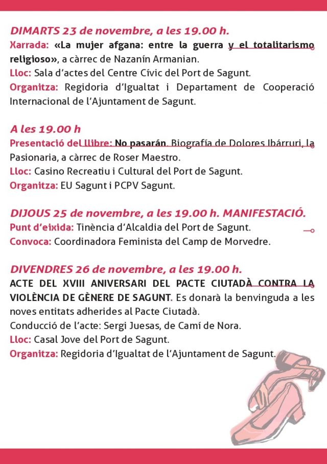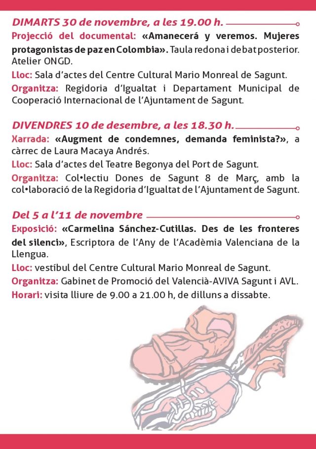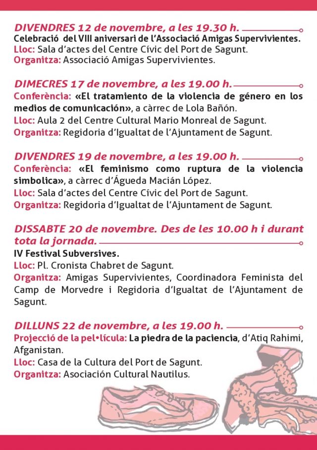 Actividades por el Día Internacional contra la Violencia de Género en Sagunto Sagunto organizad con motivo del Día Internacional contra la Violencia de Género una programación con diferentes actividades que se celebrarán a lo largo del mes ¿Cuándo? Fecha Del Friday, 05 de November del 2021 al Friday, 26 de November del 2021 HORA 19:00 h ¿Dónde? LUGAR Sagunto Sagunto Ver ficha El Ayuntamiento de Sagunto ha organizado con motivo del Día Internacional contra la Violencia de Género una programación con diferentes actividades que se celebrarán a lo largo del mes y entre las que destaca el Pacto Ciudadano, la cuarta edición del Festival Subversivas y la manifestación del 25 de Noviembre, así como diferentes charlas, ponencias, proyecciones y exposiciones. La programación del 25N comenzará el 5 de noviembre con la proyección del documental Sacar a la luz y la conferencia Los territorios de frontera: necropolítica y espacios de resistencia. Además, el sábado 6 de noviembre tendrá lugar la mesa redonda Feminismo dentro del pueblo gitano y el viernes 12 de noviembre será la celebración del VIII aniversario de la Asociación Amigas Supervivientes. El miércoles 17 de noviembre, será el turno de la conferencia El tratamiento de la violencia de género en los medios de comunicación y, por otra parte, el 19 de noviembre la de El feminismo como ruptura de la violencia simbólica. Las actividades continúan el sábado 20 de noviembre con el Festival Subversives y el lunes 22 con la proyección de la película La piedra de la paciencia. La programación continúa el martes 23 con la charla La mujer afgana: entre la guerra y el totalitarismo religioso y la presentación del libro No pasarán. El jueves, 25 de noviembre, tendrá lugar la manifestación del 25N en repulsa a la violencia machista. Asimismo, el viernes 26 de noviembre, será el acto del XVIII aniversario del Pacto Ciudadano contra la Violencia de Género de Sagunto y el martes 30 de noviembre será la proyección del documental Amanecerá y veremos. Mujeres protagonistas de paz en Colombia. Además, el 10 de diciembre será la charla Augment de condemnes, demanda feminista? y del 5 al 11 de noviembre será la exposición Carmelina Sánchez-Cutillas. Des de les fronteres del silenci. Programa por días