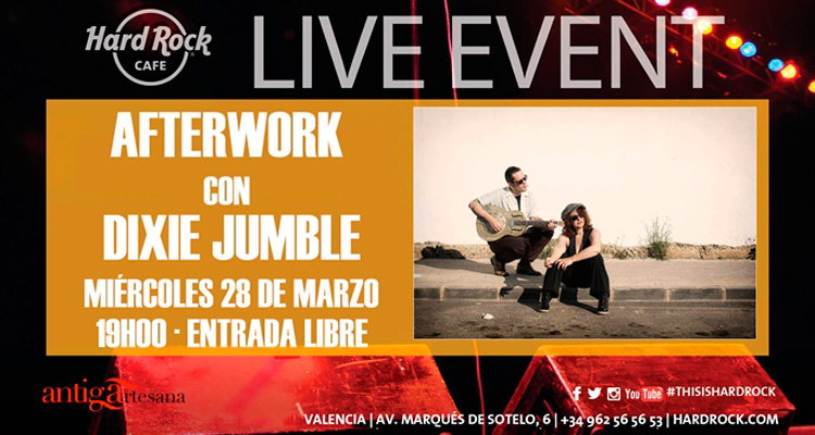 Afterwork con Dixie Jumble en Hard Rock Cafe Valencia Dixie Jumble actúa en un concierto gratuito el 28 de marzo en Hard Rock Cafe Valencia ¿Cuándo? Fecha Del Wednesday, 28 de March del 2018 al Wednesday, 28 de March del 2018 HORA 19:00 h ¿Dónde? LUGAR Hard Rock Cafe Valencia Avenida Del Marqués de Sotelo 6 46002 Valencia Ver ficha El miércoles 28 de marzo a las 19:00h Hard Rock Cafe Valencia organiza un afterwork con Dixie Jumble. Un concierto gratuito para disfrutar con amigos. Te mereces un descanso, y qué mejor manera de desconectar que con música en directo, cervezas y risas. ¿Quieres hacer nuevos planes? Entra en nuestra agenda de eventos y descubre qué hacer esta primavera, hay opciones para todos los gustos y bolsillos. Si eres de los que aún sigue en la oficina el miércoles santo, te mereces tu momento amplified. En Hard Rock Cafe calientan motores de cara al puente de Semana Santa con Dixie Jumble en directo. Un tardeo de jazz acústico con un repertorio inspirado en artistas como Billie Holiday, Peggy Lee o Barney Kessel. En el afterwork podrás probar la nueva cerveza, Antiga Cerveza Artesanal Valenciana “De la terreta”. Te recomendamos que la acompañes con los entrantes más deseados del local: los nachos y alitas de pollo. Los miércoles en Hard Rock Café se viven a lo grande. Artículos relacionados Primavera en Valencia Mostra de Vinos y Alimentos de la Comunidad Valenciana Tardeo en Valencia Los castillos más bonitos de la Comunidad Valenciana