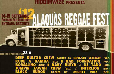 Alaquás Reggae Fest 2012 Toda la música Reggae en Alaquás ¿Cuándo? Fecha Del Friday, 14 de September del 2012 al Saturday, 15 de September del 2012 HORA 01:00 h ¿Dónde? LUGAR Alaquàs Alaquàs Ver ficha Vuelve Alaquás Reggae Fest 2012 de la mano de Riddiemuize, en el Poligon Els Mollons. Los días 14 de septiembre (a partir de las 23:00h) y el día 15 de septiembre ( a partir de las 20:00h). Vuelve a disfrutar de toda la música Reggae en compañia de los mejores grupos. Con Deep Kultxa Crew backed by Brozak Selektah (Vlc), Black Huron backed by Mighty Vybz (Bcn), Borsalino Sound (Bcn), Daby Bleyd & Dj Tano (Mu), Bad Foundation, Kude A Bamba (Vlc), Jumpin’ Jawah Crew & Interlion (Vlc), Supa Bassie backed by Cannatonic (Vlc), Bambiriling feat. Paupa Man (Cst), Sensi Garden feat. Karakuerno (Mad), Weedow & Sherpa Selektah feat. Miguel Arraigo (Bcn), King Horror (Bcn), Van De Ramah (Mu), Slowly Man, Faba Raid (Vlc) y Attitude Dancehall Crew.