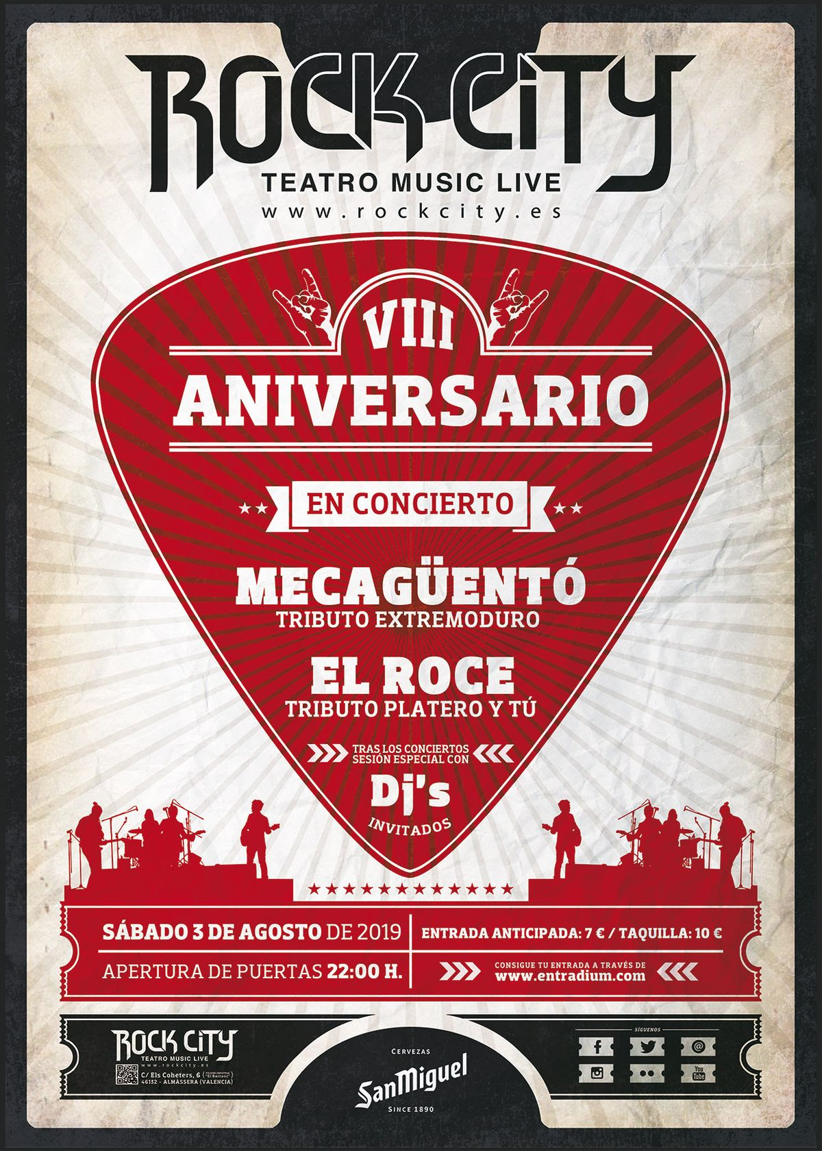 VIII Aniversario Rock City en Valencia Disfruta del mejor rock en Valencia gracias a los conciertos que nos ofrece Rock City en su octava edición ¿Cuándo? Fecha Del Saturday, 03 de August del 2019 al Saturday, 03 de August del 2019 HORA 22:00 h ¿Dónde? LUGAR Rock City Almàssera C/ Els Coheters nº6 Ver ficha Si eres un amante del rock, no puedes perderte la octava edición del Rock City, que se celebra el día 3 de agosto en Valencia a partir de las 22:00 h. Este año en Rock City podrás disfrutar del mejor rock en directo, de la mano de artistas como Mecagüentó (Tributo a extremo duro) y El Roce (Tributo a Platero y Tu). Además una vez finalice el concierto se realizará una sesión especial con Dj’s invitados. Este concierto es una oportunidad para los más apasionados de la música rock. Después de ocho años, Rock City sigue siendo una alternativa genial para pasar una noche repleta de rock en directo en una de las salas más míticas de Valencia, como es la sala rock city, donde se han celebrado un sin fin de conciertos épicos. El coste de las entradas son 7 euros si la adquieres de forma anticipada y 10 euros si la compras en taquilla. El aforo es limitado así que compra ya tus entradas y no te quedes sin sitio. Si te gusta la música en directo también puedes consultar nuestra agenda de conciertos, y así podrás estar al tanto de todos los conciertos que hay en Valencia. Y si no sabes que hacer por Valencia te dejamos unas cuantas ideas. Artículos relacionados Sesiones de Dj’s en los escalones del IVAM Concerts de Vivers 2023 FIB Festival 2025 Festival de Jazz de València