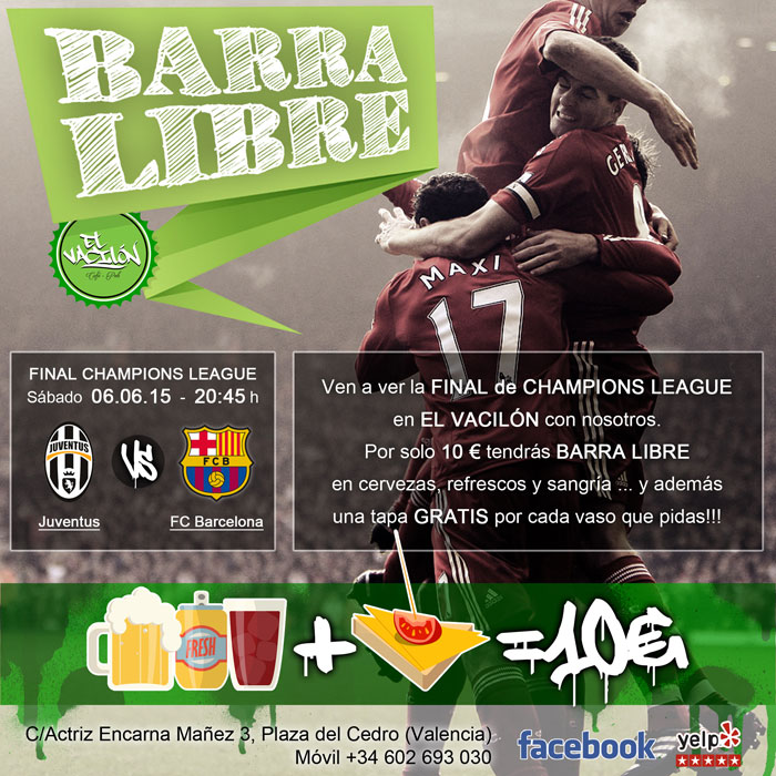 Barra Libre para la Final de Champions League ¿Cuándo? Fecha Del Saturday, 06 de June del 2015 al Saturday, 06 de June del 2015 HORA 20:30 h Ven a ver la final de CHAMPIONS LEAGUE de JUVENTUS Vs F.C. BARCELONA en El Vacilón. El partido se transmitirá el sábado 6 de junio 2015 a las 20:45 en nuestras pantallas. Ofreceremos una BARRA LIBRE durante la transmisión de todos los partidos!!! Con 10 € tendrás derecho a cerveza, sangría y refrescos de forma ilimitada, además cada vez que pidas una bebida, esta será acompañada por una tapa de regalo, ofrecida por nuestros cocineros!!! Que esperas?!?! El Vacilón Calle Actriz Encarna Mañez 3, Zona del Cedro, Valencia Tel. +34 602 693 030 [email protected]