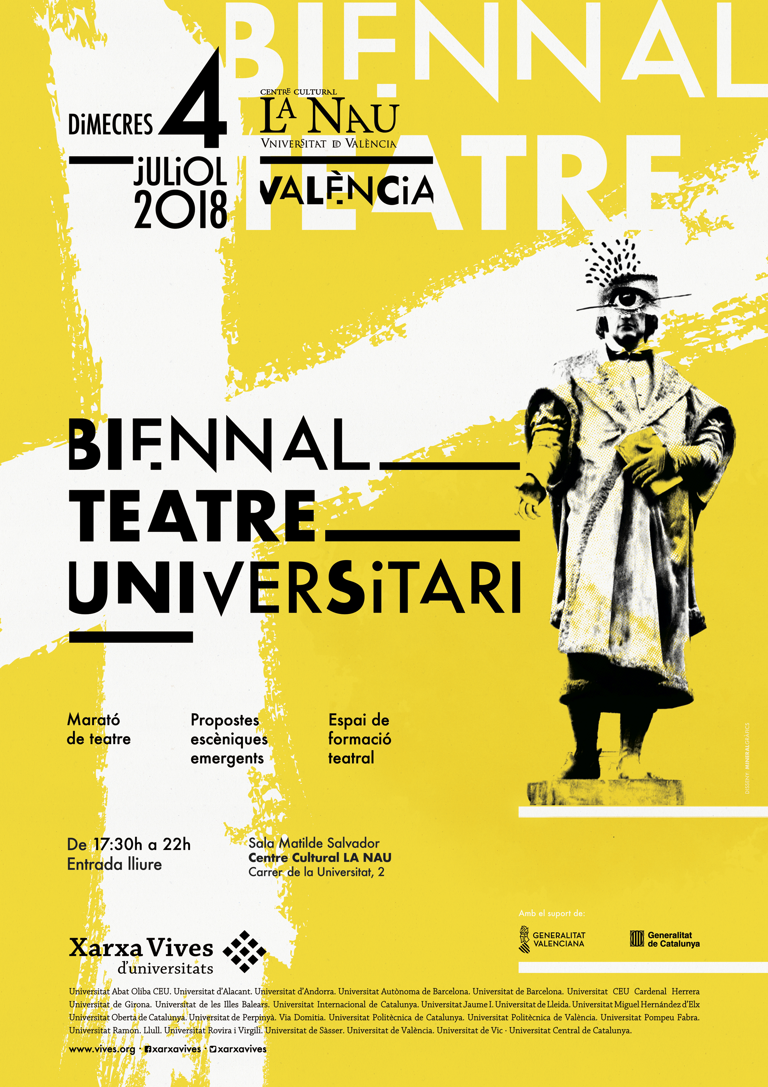 Biennal de Teatre Universitari en La Nau Pásate por el maratón de teatro y disfruta de más de seis piezas diferentes de los grupos de teatro de las universidades de la Comunidad Valenciana ¿Cuándo? Fecha Del Wednesday, 04 de July del 2018 al Wednesday, 04 de July del 2018 HORA 17:30 h ¿Dónde? LUGAR La Nau C/ Universitat, 2 Ver ficha El 4 de julio llega el Biennal de Teatre Universitari en el Centro Cultural La Nau de la Universidad de Valencia. La entrada es gratuita y contará con varias actuaciones. Si te interesan los eventos de la ciudad consulta nuestra agenda. Se trata de un evento en el que participan varias universidades. Cada una puede representar una obra que no dure más de treinta minutos. Este tipo de espectáculo permitirá a los espectadores ver diferentes obras de teatro y estilos en una misma jornada. Se representarán desde obras clásicas hasta propuestas de teatro alternativo o novedoso. Este evento es itinerante y permite que los estudiantes de diferentes lugares compartan sus experiencias y se nutran unos a otros. Además dentro de esta actividad se ofrecerán talleres y cursos para que todas las personas interesadas puedan aprender e informarse. Se representarán seis obras teatrales durante toda la tarde. Programa 17:30 h Fragmento de ’En defensa de la cultura 1937-2018′, de Javier Sahuquillo. Dirección de Pep Sanchis i Josep Valero Grupo: ASSAIG (Grupo de Teatro de la Universidad de València) 18:15 h ‘EN DEFENSA. Un concierto de despedida’, de Lola Blasco. Direcció d’Iván Jiménez Grupo: Aula de Teatro de la Universidad de Alicante Sinopsis: Es una pieza que trata los temas que preocupan a los jóvenes en la actualidad, la precariedad laboral, la aceptación y la mediocridad. Se hacen muchas preguntas e invita al análisis y la reflexión. 19 h ‘Antígona’ de Sòfocles. Traducción de Joan Castellanos i Vila. Dirección de Pep Anton Gómez Grupo: Aula de Teatro de la Universidad Pompeu Fabra 19:45 h ‘Una mirada, un pensament’, de Adan Rodríguez basado en los poemas de Vicent Andrés Estellés. Dirección Adan Rodríguez Grupo de Teatro de la Universidad Miguel Hernández de Elche Sinopsis: Es una performance teatral que se basa en los textos de Vicent Andrés Estellés, es una reflexión y pieza antifascista, una forma de huida a través de la poesía y el teatro con imágenes de la represión. Una lucha constante por la supervivencia y la dignidad. 20:45 h ‘Quin Quadre!!!’, del Grupo de Teatro UIC Barcelona (redacción colectiva) Dirección de Carles Bigorra Grupo de Teatro UIC Barcelona Sinopsis: Es una pieza creada entre todos, con dosis de juventud, humor y también música. Reflexiona sobre lo que es arte y lo que no. Un recorrido desde el arte del pasado y el actual. 21.30 h ‘Mary de Frankestein’ de Mary Shelley. Dirección de Russell DiNapoli Grupo: Aula de Teatro de la Universitat Politècnica de la València Sinopsis: Las novedades que incorpora la adaptación es que el engendro es una mujer y su creador es el verdadero monstruo. La criatura recibe el nombre de Mary, lo que provoca que se sienta más humana pero la gente la rechaza por su físico. El creador la abandona y la condena a la soledad, lo que la empuja a sentimientos de ira y de defender su dignidad ante un mundo superficial que solo siente asco y rechazo hacia ella. Cartel Artículos relacionados I Want U Back en el Teatro Olympia “Els Nostres” en el Teatro Principal Valencia ‘HOLLYMOOG’ en el Teatro Olympia ‘Adiós Arturo’ en el Teatro Olympia
