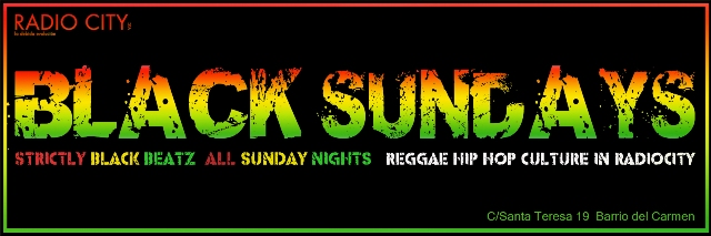 Black Sundays ¿Cuándo? Fecha Del Sunday, 27 de May del 2012 al Sunday, 27 de May del 2012 HORA 23:00 h ¿Dónde? LUGAR Radio City calle Santa Teresa 19 Ver ficha La música negra en todas sus facetas: hip hop, reggae, dancehall, soca, soul, funk, jazz, mash up.