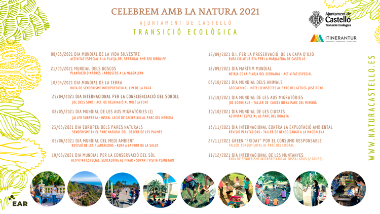 Rutas gratuitas con “Celebrem amb la natura” Itinerantur y el Ayuntamiento de Castellón organizan rutas gratuitas como parte de la campaña "Celebrem amb la natura". Un plan de ocio para disfrutar de la naturaleza de Castellón ¿Cuándo? Fecha Del Saturday, 19 de June del 2021 al Saturday, 19 de June del 2021 HORA 10:30 h ¿Dónde? LUGAR Castellón Castellón Ver ficha Itinerantur se une a la campaña del Ayuntamiento de Castellón de la Plana que realiza eventos gratuitos bajo el lema “Celebrem amb la natura”. Si buscas planes de ocio, quieres escapar de la rutina y te gusta la naturaleza, este plan es perfecto para hacer con amigos o en familia. Descubre en nuestra agenda la próxima ruta gratuita y no te quedes sin plan. Para participar en cualquiera de las actividades es imprescindible inscribirse en este enlace. Para más información sobre las rutas puedes enviar un correo a [email protected] o llamar al 611 49 60 58 (también WhatsApp). Próximas rutas Día Europeo de los Parques Naturales – Sábado 19 de junio En la Comunidad Valenciana existen 22 parques naturales, 8 de los cuales se encuentran en la provincia de Castellón. Dos de ellos, las islas Columbretes y el Desert de les Palmes, pertenecen (en parte) al término municipal de Castellón. Por ello, se propone una ruta de senderismo interpretativo en el P.N. del Desert de les Palmes. Será de dificultad baja, de unos 4 kilómetros, orientada a un público general. Además, se contará con alguno de los técnicos del Parque Natural para que pueda explicar su labor y se comprenda la importancia de los Parques Naturales. Quien quiera, al acabar podrá visitar el Centro de Interpretación del Parque Natural. Información de la ruta del día 19 de junio: Lugar: Desierto de Las Palmas. Centro de Espiritualidad Santa Teresa Hora: 10:00 h Duración: 3 horas Precio: gratuita Dificultad: fácil Público recomendado: para todos los públicos Calendario de actividades Celebrem amb la natura 2021 Artículos relacionados Escapadas y Excursiones en la Comunidad Valenciana Ruta de los Olivos Milenarios por el Maestrat Cuevas espectaculares de la Comunidad Valenciana Realfooding en València