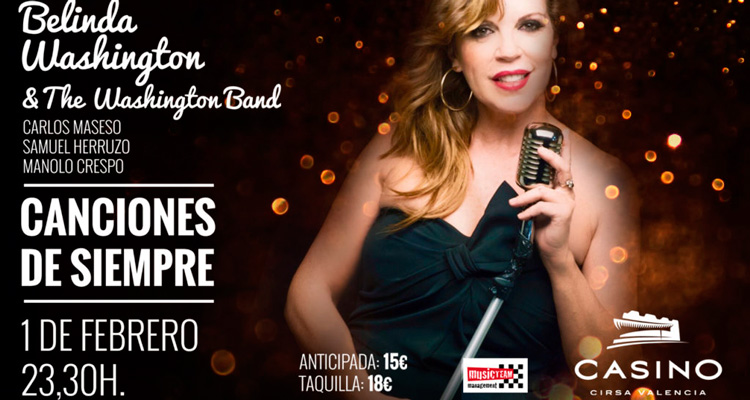Canciones de siempre en Casino Cirsa Valencia Casino Cirsa Valencia presenta a Belinda Washington y su banda de jazz, en concierto el 1 de febrero ¿Cuándo? Fecha Del Friday, 01 de February del 2019 al Friday, 01 de February del 2019 HORA 23:30 h ¿Dónde? LUGAR Casino Cirsa Avda. de las Cortes Valencianas, 59 Ver ficha Comprar entradas Casino Cirsa Valencia presenta el viernes 1 de febrero a partir de las 23:30 horas en directo a The Washington Band en concierto, un cuarteto liderado por la actriz y famosa presentadora de TV Belinda Washington que se ha hecho un hueco en los escenarios interpretando grandes éxitos de blues, swing y jazz. Da la bienvenida a febrero a golpe de música con las Canciones de siempre en Casino Cirsa Valencia y disfruta de una noche inolvidable. Febrero llega cargado de eventos, consulta los mejores planes en nuestra agenda y apunta los que más te interesen. Belinda Washington, conocida por haber sido unas de las “chicas Hermida” o por haber presentado programas como “Qué me dices!”, recientemente ha aparecido en “Tu cara me suena” de Antena 3 donde imitó a Rita Hayworth, formó su banda hace unos años para recordar la música que popularizaron las grandes damas del jazz como Ella Fitzgerald, Etta James, Julie London o Billie Holliday y para dar rienda suelta a la vena musical de la propia Belinda. En sus actuaciones, el grupo consigue emocionar al público a través de grandes éxitos interpretados de forma íntima y elegante. Acompañan a la popular ‘chica Hermida’ y rostro habitual de la pequeña pantalla en los 90, músicos de reconocida trayectoria como Carlos Maeso (bajo), Samuel Herruzo (piano y saxo) y Manolo Crespo (batería). Después de varios conciertos por toda España, recalarán el viernes 1 de febrero en la sala de fiestas del casino valenciano donde prometen mucho ritmo, risas y buenas canciones. El casino valenciano presenta una de sus famosas noches de música en directo en formato café-teatro con The Washington Band en una velada que promete ser inolvidable. El precio de las entradas es de 15€ con venta anticipada y de 18€ en taquilla. Puedes adquirir tus entradas en el botón de Comprar entradas que hay debajo del mapa. Artículos relacionados Mercado Tradicional en Ruzafa Escape room en València Menuda Filmo Murcia Attacks en Kinépolis València