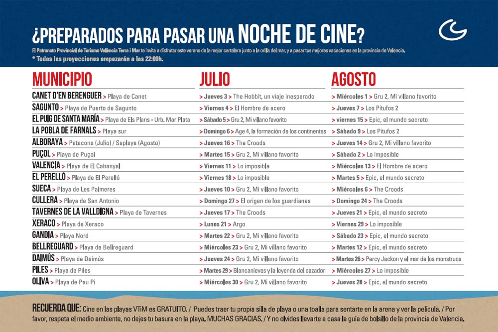Gracias al Patronato de Turismo València, Terra i Mar, las playas de Valencia se convierten este verano en salas de cine improvisadas. Desde el jueves 3 de julio hasta el viernes 29 de agosto, se proyectarán películas en 18 playas de la provincia de Valencia.