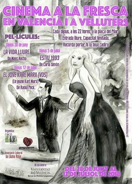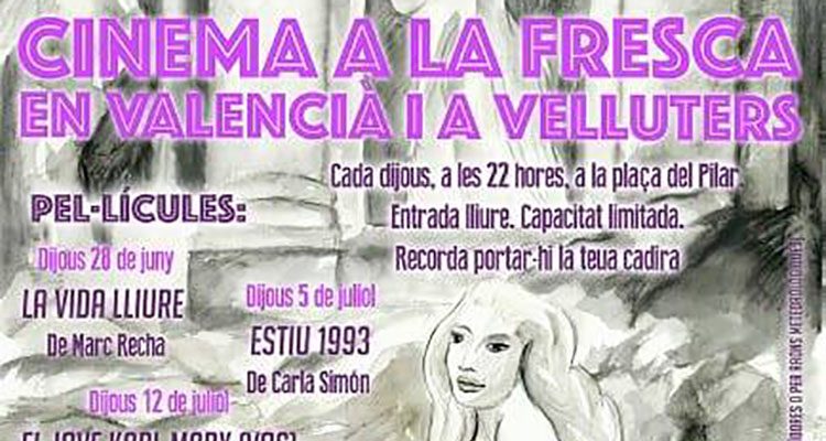 Cinema a la fresca en Velluters La Plaza del Pilar acoge el Cinema a la Fresca de Velluters, cine de verano al aire libre y en valenciano ¿Cuándo? Fecha Del Thursday, 28 de June del 2018 al Thursday, 12 de July del 2018 HORA 22:00 h ¿Dónde? LUGAR Valencia Valencia Ver ficha El Racó de la Corbella y Ciutat Vella Batega organizan el Cinema a la fresca en Velluters con tres películas del 28 de junio al 12 de julio. Consulta en la agenda de Valencia toda la información sobre los cines de verano en Valencia. El Cinema a la fresca en Velluters se celebra a las 22:00h en la Plaza del Pilar. Este cine de verano en Valencia cuenta con la particularidad de que todas las películas se proyectan en versión original con subtítulos en valenciano. Este evento de cine en valenciano es de entrada gratuita y aforo limitado. Recuerda que tienes que llevarte tu propia silla. Programación: 28 de junio: La vida libre de March Recha 5 de julio: Verano 1993 de Carla Simón 12 de julio: El joven Karl Marx de Raoul Peck Cartel de Cinema a la fresca en Velluters Artículos relacionados Cine de verano en Autocine Star Cine de verano en Benimaclet Cine de verano en la Terraza Lumiere Cine de verano en la Terraza Flumen