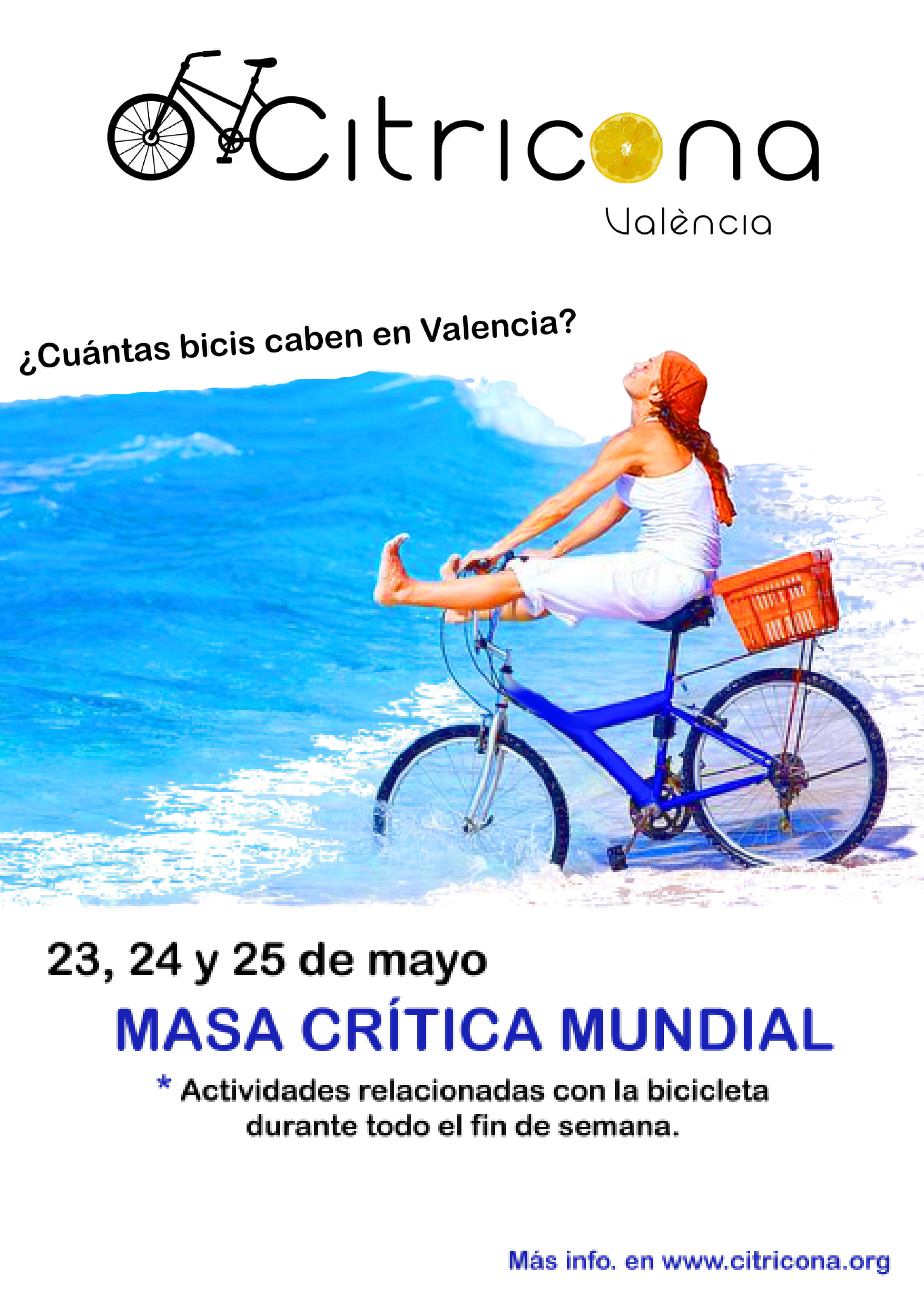 El acto central de Citricona Valencia 2014 se celebrará el sábado 24 a las 18h, en el que desde el Tinglado Nº2 del Puerto de Valencia partirá una ruta por Valencia con el recorrido que decidan los participantes según vaya transcurriendo la marcha. La masa crítica, seguidores de Citricona Valencia 2014, llenará Valencia con este programa de actos: