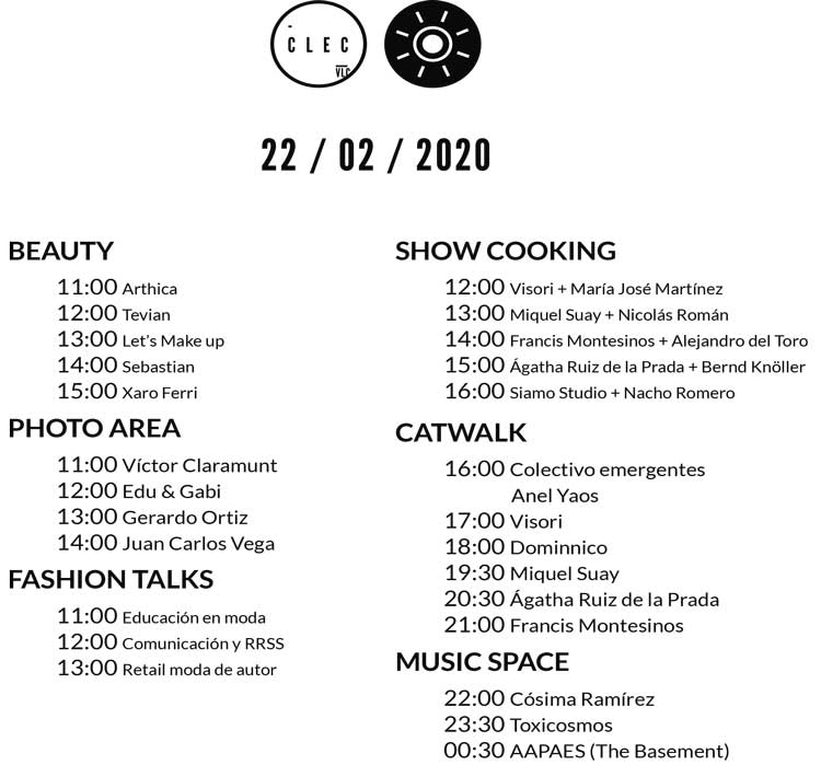 CLEC Fashion Festival Diseñadores, fotógrafos, maquilladores, chefs y hasta DJs se dan la mano en el primer festival de moda de València ¿Cuándo? Fecha Del Friday, 21 de February del 2020 al Saturday, 22 de February del 2020 HORA 11:00 h ¿Dónde? LUGAR Hemisfèric Avda. del Professor López Piñero, 3 Ver ficha Comprar entradas Los próximos viernes 21 y sábado 22 de febrero la moda valenciana tiene una cita en CLEC Fashion Festival. Un proyecto impulsado por la asociación de diseñadores de moda valenciana (DIMOVA) que busca conectar las distintas aristas del sector a través de un formato festivo que se aleja de las semanas de la moda más tradicionales. Una oda a la moda que se convertirá en una cita, un lugar, un sentimiento compartido, una experiencia única para todos lo que aman este sector y las artes que lo rodean. Consulta la agenda de València si no quieres perderte más eventazos como este. Gastronomía, planes gratuitos y un sinfín de opciones para todos los gustos y edades. El primer festival de moda que combina moda, fotografía, belleza, gastronomía, cine y música que tendrá lugar el viernes 21 y sábado 22 de febrero en el Hemisfèric, de la Ciutat de les Arts i les Ciències. Diseñadores consagrados como Francis Montesinos, Ágatha Ruiz de la Prada, Dolores Cortés, Leandro Cano, Isabel Sanchís o Miquel Suay se unen a la apuesta por jóvenes firmas valencianas como Siamo Studio, Sonia Carrasco, 404 Studio, Visori Fashionart, Álvaro Mars e Yvan Andreu. Y como en todo festival, la música también será un elemento fundamental. En el Music Space actuarán parejas efímeras formadas por DJs de todo el país y jóvenes talentos del audiovisual. En la zona gourmet varios chefs valencianos se aliarán con grandes diseñadores para crear tapas inspiradas en la colorimetría, los volúmenes y las texturas de las propuestas presentadas por los creadores en la pasarela. Por último, los fashion films también tendrán su lugar de la mano del reconocido director Víctor Claramunt. Todo esto y mucho más es lo que será CLEC, el primer festival de moda en València que quiere crear lazos entre personas que comparten la misma pasión. Para todos los que aman la moda, para los que se hacen preguntas, para los que apuestan por el diseño sostenible, para todo el talento valenciano que nunca se ha rendido y también para los que ahora hacen que esta ciudad despierte. Algo va a hacer CLEC así que compra ya tu entrada. Entradas CLEC Horarios Clec: Viernes 21 de febrero Sábado 22 de febrero Artículos relacionados Restaurantes con Estrella Michelin en València Concierto de Beret en València Ruta de tiendas de Segunda Mano en Valencia Spas en Valencia