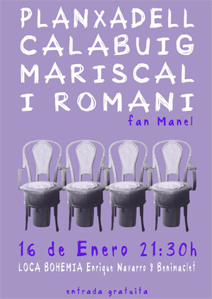 Concert acústic homenatge a Manel. ¿Cuándo? Fecha Del Friday, 16 de January del 2015 al Friday, 16 de January del 2015 HORA 21:30 h ¿Dónde? LUGAR Benimaclet Benimaclet Ver ficha PLANXADELL, CALABUIG, MARISCAL I ROMANÍ FAN MANEL. LOCA BOHEMIA, Enrique Navarro, 8, València, 16/01/2015, 21:30hrs. Entrada gratuïta. El recital acústic “Planxadell, Calabuig, Mariscal i Romaní fan Manel” és un homenatge cassolà i acústic al grup barceloní. Un concert íntim però simpàtic, un viatge pels racons dels seus tres albums i alguna cara b i, en definitiva, un moment per a escoltar i deixar-se portar per l’univers Manel ple d’històries i personatges peculiars amb la Mediterrània sempre present. Una estona de cel. Formació: -Manel Planxadell: guitarra clàssica, kazoo, teclats i veu principal. -Manel Calabuig: guitarra acústica, ukelele i veus. -Manel Mariscal: percussió i veus. -Manel Romaní: guitarra acústica i ukelele.