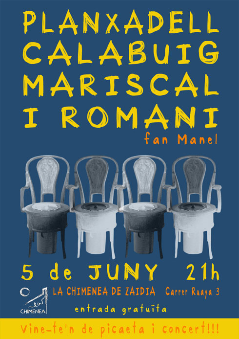 Concert acústic homenatge a Manel. ¿Cuándo? Fecha Del Friday, 05 de June del 2015 al Friday, 05 de June del 2015 HORA 21:00 h PLANXADELL, CALABUIG, MARISCAL I ROMANÍ FAN MANEL LA CHIMENEA DE ZAIDÍA, C/ RUAYA, 3, València 05/06/2015, 21:00hrs. Entrada gratuïta. El recital acústic “Planxadell, Calabuig, Mariscal i Romaní fan Manel” és un homenatge cassolà i acústic al grup barceloní. Un concert íntim però simpàtic, un viatge pels racons dels seus tres albums i alguna cara b i, en definitiva, un moment per a escoltar i deixar-se portar per l’univers Manel ple d’històries i personatges peculiars amb la Mediterrània sempre present. Una estona de cel. Formació: -Manel Planxadell: guitarra clàssica, teclats i veu principal. -Manel Calabuig: guitarra acústica, ukelele i veus. -Manel Mariscal: percussió i veus. -Manel Romaní: guitarra acústica i ukelele.