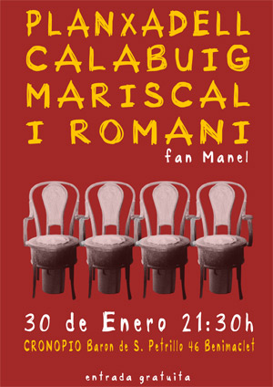 Concert acústic homenatge a Manel. ¿Cuándo? Fecha Del Friday, 30 de January del 2015 al Friday, 30 de January del 2015 HORA 21:30 h ¿Dónde? LUGAR Café Cronopio C/ Barón de San Petrillo, 46 Ver ficha PLANXADELL, CALABUIG, MARISCAL I ROMANÍ FAN MANEL Café Cronopio, Barón de San Petrillo, 46, València, 30/01/2015, 21:30hrs. Entrada gratuïta El recital acústic “Planxadell, Calabuig, Mariscal i Romaní fan Manel” és un homenatge cassolà i acústic al grup barceloní. Un concert íntim però simpàtic, un viatge pels racons dels seus tres albums i alguna cara b i, en definitiva, un moment per a escoltar i deixar-se portar per l’univers Manel ple d’històries i personatges peculiars amb la Mediterrània sempre present. Una estona de cel. Formació: -Manel Planxadell: guitarra clàssica, kazoo, teclats i veu principal. -Manel Calabuig: guitarra acústica, ukelele i veus. -Manel Mariscal: percussió i veus. -Manel Romaní: guitarra acústica i ukelele.