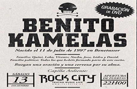 Concierto de Benito Kamelas en Almàssera El 13 de diciembre esta banda de Rock and Roll ofrece su último concierto de la gira 2014 "Requiem por Benito Kamelas" ¿Cuándo? Fecha Del Saturday, 13 de December del 2014 al Saturday, 13 de December del 2014 HORA 22:00 h ¿Dónde? LUGAR Rock City Almàssera C/ Els Coheters nº6 Ver ficha El sábado 13 de diciembre Benito Kamelas ofrece su último concierto de su gira de este 2014 en el Rock City de Almàssera. Disfruta de toda la oferta de conciertos en Valencia. Este grupo de rock valenciano acude a Valencia para poner fin a su gira “Requiem por Benito Kamelas” en un concierto único, que ningún amante del rock debería perderse. Gira “Requiem por Benito Kamelas” El grupo Benito Kamelas se despide de esta gira el 13 de diciembre y también de su andadura que comenzó en 1997, pues su gira “Requiem por Benito Kamelas” según ha afirmado el propio grupo será la última como Benito Kamelas. Tras pasar por diferentes puntos de la geografía española como Teruel, Cuenca, Alicante, Zaragoza etc., ahora se preparan para los próximos conciertos y para su fin de gira en Almàssera (Valencia) el 13 de diciembre de 2014. ¡No te puedes perder este fantástico concierto en Valencia! “Buena energía” es el último trabajo de este grupo de rock valenciano que llevan 6 discos de estudio y 1 en directo, a sus espaldas tras 15 años subidos a los escenarios. Horario y entradas El sábado 13 de diciembre se celebra el último concierto de Benito Kamelas en el Rock City de Almàssera, Valencia, a las 22:00. La entrada anticipada cuesta 12 euros (+ gastos de gestión) y en taquilla 15. Las entradas anticipadas se puede conseguir en Harmony Discos y en www.ticketea.com. Además las 250 primeras entradas que se consigan a través de esa página web tendrán de regalo el CD “Buena energía”. ¡Disfruta del mejor rock español con uno de los mejores conciertos en Valencia! [youtube]http://www.youtube.com/watch?v=5Wuzo-s6Lu4[/youtube] Artículos relacionados Conciertos Valencia Visita las Salas de Conciertos de Valencia Monólogos Valencia