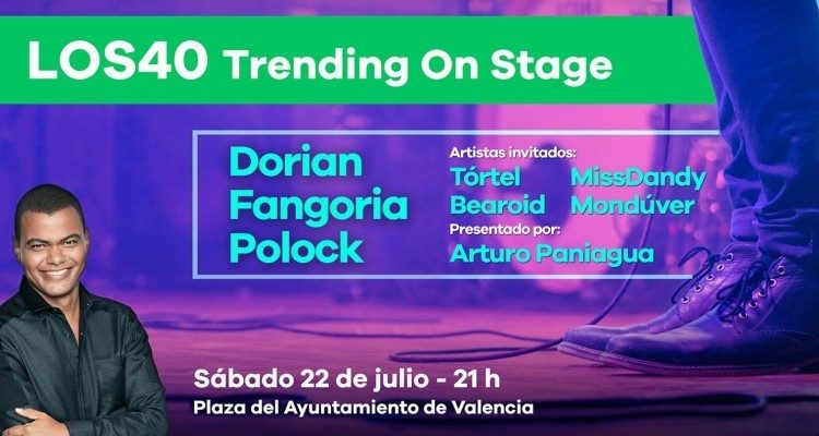 Concierto de LOS40 Trending en Valencia LOS40 Trending On Stage cierra su primera temporada el 22 de julio con un festival en la Plaza del Ayuntamiento de Valencia. Este concierto forma parte de la programación de la Gran Fira de València. ¿Cuándo? Fecha Del Saturday, 22 de July del 2017 al Saturday, 22 de July del 2017 HORA 21:00 h ¿Dónde? LUGAR Plaza del Ayuntamiento Pza. del Ayuntamiento s/n Ver ficha LOS40 Trending On Stage cierra su primera temporada el 22 de julio con un festival en la Plaza del Ayuntamiento de Valencia, evento que forma parte de la Gran Fira de València. Descubre más conciertos en Valencia en la Agenda de Valencia. Y si buscas otros planes baratos no dejes de consultar nuestra agenda de eventos gratuitos en València. El concierto de LOS40 Trending tendrá lugar el 22 de julio a las 21:00h y será de entrada gratuita. Los artistas invitados a este evento so: Polock, Fangoria y Dorian. Tres nombres principales en los carteles de festivales de este verano. Además contará con las apariciones especiales de Tórtel, MissDandy, Mondúver y Beraoid. Tres grupos de talento musical emergente en la ciudad de valencia. Tórtel práctica un pop alternativo dulce, mientras que MissDandy encamina su estilo hacia un post-punk y Beraoid hacia la electrónica. Mondúver es una nueva aventura musical de tres miembros del grupo de La Habitación Roja. LOS40 Trending On Stage van a revolucionar este verano Valencia. ¿Te apuntas? Artículos relacionados Gran Fira de València 2019 Gran Nit de Juliol | Feria de Julio 2019 Verano Programa de la Feria de Julio 2019