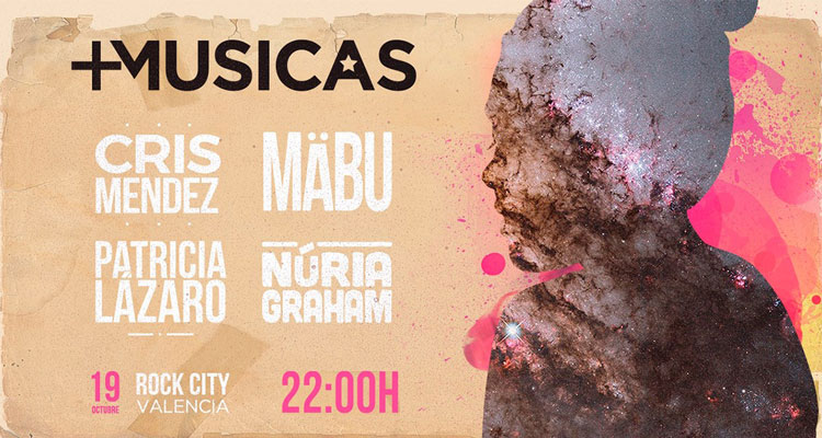 Concierto Más Músicas en València El próximo 19 de octubre no te pierdas a Mäbu, Cris Méndez, Patricia Lázaro y Nuria Graham en Rock City València ¿Cuándo? Fecha Del Friday, 19 de October del 2018 al Friday, 19 de October del 2018 HORA 22:00 h ¿Dónde? LUGAR Rock City Almàssera C/ Els Coheters nº6 Ver ficha Más Músicas trae a València el próximo viernes 19 de octubre el concierto de Mäbu, Cris Méndez, Patricia Lázaro y Nuria Graham. Un evento que fomenta la igualdad de género en el ámbito de la música. Si no sabes qué hacer en València y te apetece hacer planes de ocio diferentes, consulta nuestra agenda, encontrarás conciertos como este y mucho más. El concierto será en Rock City València a las 22:00h y el precio de la entrada es de 22 euros. Se trata de un evento que mezcla varios estilos y artistas que tienen en común su fuerza y personalidad. Más de dos horas de buena música en directo donde tendrás la oportunidad de descubrir a cantantes con gran talento de nuestro país, a la vez que contribuyes a que cambien las cosas. Más Músicas es una plataforma independiente que promueve la figura femenina en la música de España. Para ello, desarrollan un programa y una red de apoyo que empieza por los colegios y continúa con mentorship a jóvenes músicas. Además, crean ciclos de conciertos y festivales propios con el objetivo de promover la visibilidad y la igualdad de oportunidades de más músicas en festivales y medios. ¿Te unes a la causa? Cartel: Artículos relacionados Ciclo de conciertos en La Marina de València Berklee Showcase IX El festival Locos por la Música llega a València Concierto de Film Symphony Orchestra en Valencia
