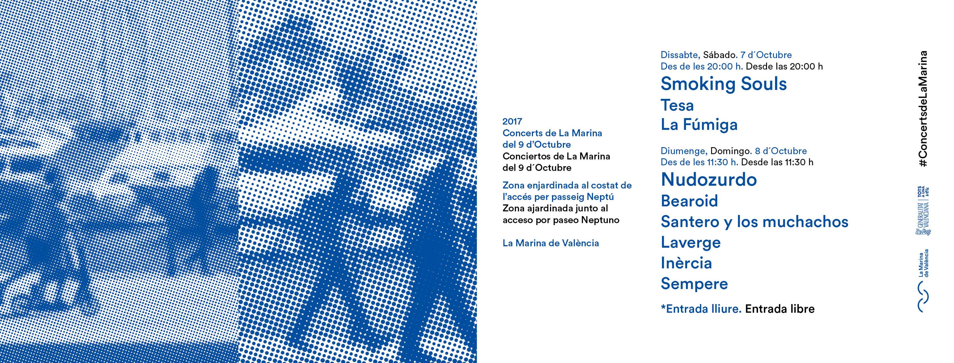 Conciertos en La Marina por el 9 de octubre La Marina de València se une a la celebración del 9 de octubre con dos jornadas de conciertos gratuitos en la terraza Malabar del edificio Veles e Vents el 7 y 8 de octubre. ¿Cuándo? Fecha Del Saturday, 07 de October del 2017 al Sunday, 08 de October del 2017 HORA 12:00 h ¿Dónde? LUGAR La Marina de València Muelle de la Aduana s/n Ver ficha La Marina de València se suma a la celebración del 9 de octubre con dos jornadas de conciertos de acceso gratuito en la terraza de Malabar en el edificio Veles e Vents. Los conciertos se celebrarán la noche del sábado 7 y a lo largo del domingo 8 de octubre. Recuerda que en nuestra agenda de conciertos puedes consultar todos los eventos musicales de la ciudad que se celebran este otoño. Los grupos valencianos Smoking Souls, Tesa,Los Muchachos o La Fúmiga comparten cartel con invitados de lujo como los madrileños Nudozurdo. Los conciertos comenzarán el 7 de octubre a las 20:00h y el 8 de octubre a las 12 del mediodía y se alargarán hasta pasadas las 22 de la noche, un plan perfecto para disfrutar de este puente en Valencia de la mejor manera posible, con música y frente al mar. Artículos relacionados Festardor 2017 Concierto solidario Pobresa Zero en Valencia Exposición sobre las mujeres y el mundo árabe en el IVAM Concierto de Bienvenida Universidad de Valencia