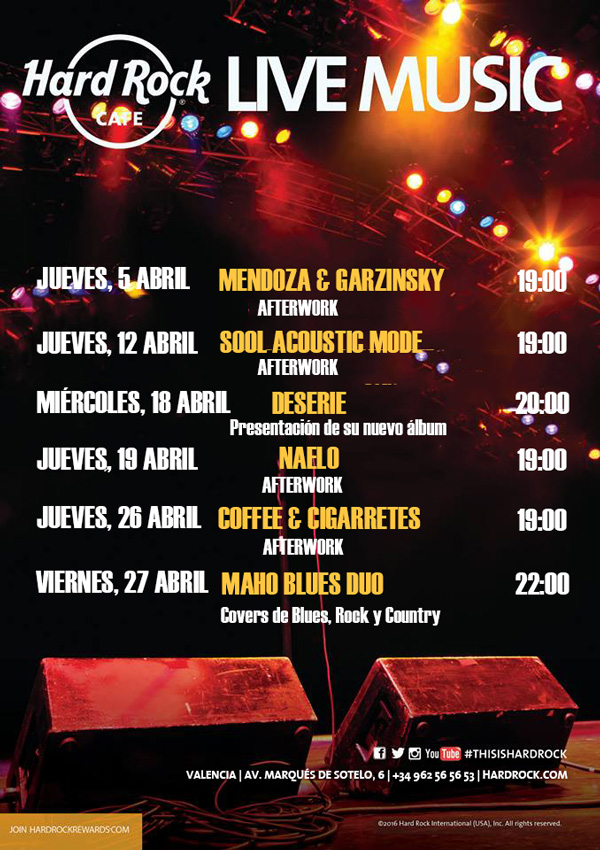 Conciertos gratuitos en los afterworks Hard Rock Cafe Valencia Los jueves en Hard Rock Cafe Valencia organizan afterworks con música en directo. ¿Cuándo? Fecha Del Thursday, 05 de April del 2018 al Thursday, 26 de April del 2018 HORA 19:00 h ¿Dónde? LUGAR Hard Rock Cafe Valencia Avenida Del Marqués de Sotelo 6 46002 Valencia Ver ficha Hard Rock Cafe Valencia organiza cada jueves del mes de abril a partir de las 19:00h, un afterwork con música en directo, para que puedas desconectar después de un largo día de trabajo o estudio con tus amigos. Si no sabes qué hacer esta primavera entra en nuestra agenda de eventos y descubre las actividades que te ofrece la ciudad: teatro, exposiciones, conciertos, rutas… A continuación presentamos el programa de conciertos gratuitos que ofrece Hard Rock para disfrutar con amigos y en buena compañía. Próximos conciertos en Hard Rock Cafe Jueves 19 de abril – NAELO El dúo formado por la carismática Anna Ferrándiz acompañada del teclista Nelo Alfonos sobre algunas bases de ritmos. Su increíble voz aborda temas propios y versiones del soul, rnb, jazz y hip-hop situándola en la escena más actual con una producción impecable. Jueves 26 de abril – COFFEE & CIGARETTES Carlos a la guitarra y Guada a la voz y percusión interpretan covers donde se entremezcla el pop, el rock y el soul con un toque personal. La originalidad reside en la valentía en interpretar canciones fuera de lo habitual y llevar al terreno más elegante canciones comerciales, dance o pop. Un planazo para disfrutar del juernes con cervecita, nachos y buena música. ¿Te apuntas? Si quieres recibir más información o reservar para comer o cenar puedes enviar un correo a [email protected] o llamar al 962 56 56 53. Artículos relacionados Agenda de excursiones y rutas en Valencia Movilidad sostenible en la Plaza del Ayuntamiento Los castillos más bonitos de la Comunidad Valenciana XIII Jornadas Gastronómicas de El Puig