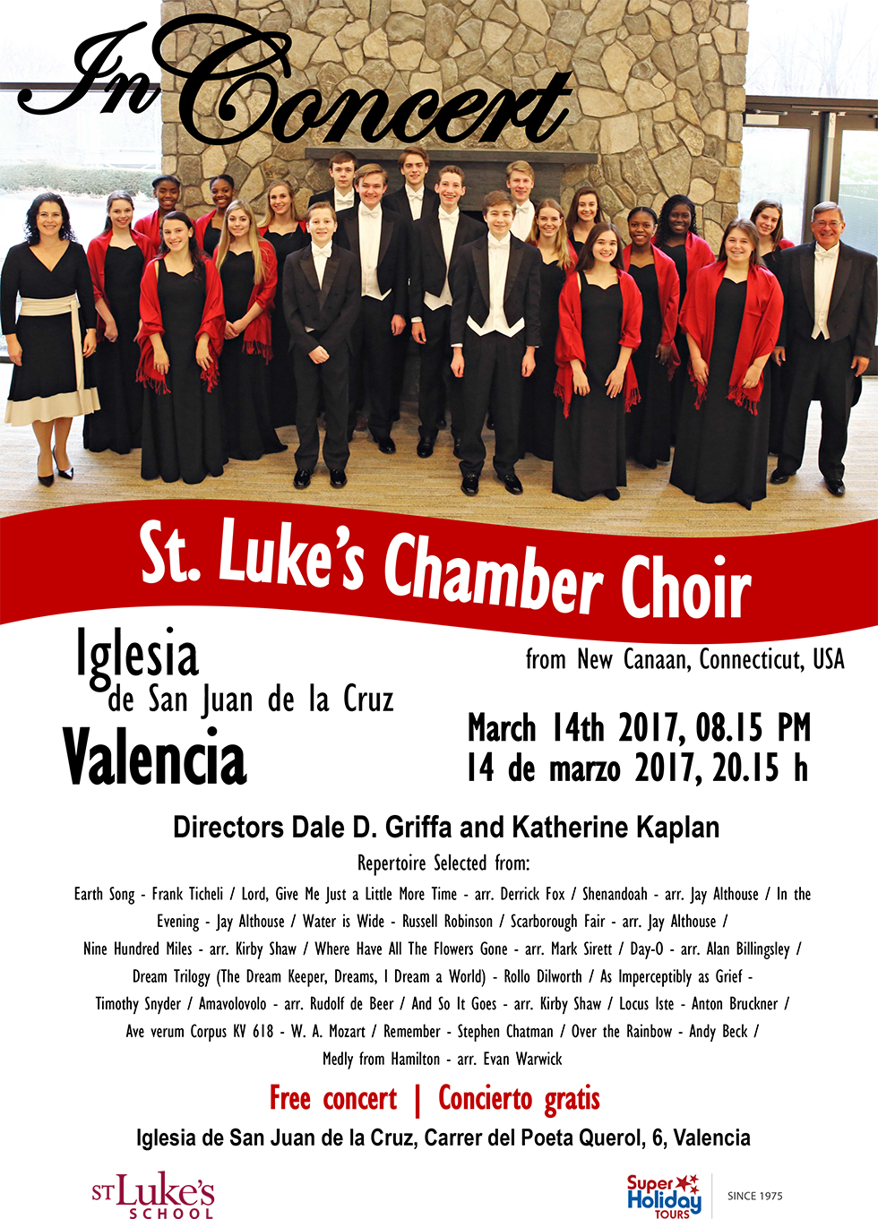 Coro Americano en Valencia Concierto gratuito de este coro americano formado por estudiantes de Connecticut (EEUU) ¿Cuándo? Fecha Del Tuesday, 14 de March del 2017 al Tuesday, 14 de March del 2017 HORA 20:15 h ¿Dónde? LUGAR Iglesia de San Juan de la Cruz POETA QUEROL, 6 Ver ficha El martes 14 de marzo, el coro Americano St. Luke’s Choir ofrecerá un concierto gratuito en la Iglesia de San Juan de la Cruz en Valencia. En una semana en la que la ciudad se prepara para las Fallas 2017, puedes disfrutar de las distintas ofertas de ocio que Valencia plantea. Conoce además la agenda de eventos gratuitos en la ciudad. Este coro Americano está formado por estudiantes del colegio Americano ‘St. Luke’s (New Canaan, Connecticut, EEUU) bajo la dirección de Dale D. Griffa y Katherine Kaplan y llegarán con su música a la céntrica Iglesia de San Juan de la Cruz; una de las primeras Iglésias que se fundaron tras la conquista de Jaime I sobre una antigua mezquita. El martes 14 de marzo, esta Iglesia – ubicada en C/ Poeta Querol, 6- recibirá este conjunto de voces armoniosas que contarán con un repertorio extenso de canciones como Scarborough Fair (arr. Jay Althouse), Over the Rainbow (Andy Beck), Nine Hundred Miles (arr. Kirby Shaw) o Ave Verum Corpus KV 618 (W.A. Mozart), entre otras. Este concierto con entrada gratuita es un plan entretenido y diferente para disfrutar en familia; vecinos y turistas. Si quieres asegurarte la plaza en este evento musical, no dudes en enviar un email a [email protected] con tu nombre y la cantidad de plazas. Artículos relacionados Fallas 2025 Xe que bo! Festival en Fallas Ofrenda de flores en Valencia Programa de Mascletaes 2017
