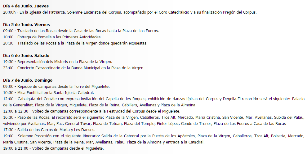 El jueves 4 de junio se realizará el pregón. El viernes se llevará a cabo el Traslado de las Rocas del Corpus Christi de Valencia de las Torres de Serrano hasta la Plaza de la Virgen. Ya el sábado de celebrarán la representación de los Misteris y el concierto de la Banda Municipal. Y el día grande, el domingo, día de la festividad del Corpus Christi de Valencia, tendrá lugar por la mañana la Cabalgata del Convite, para invitar a toda la población a participar en la procesión vespertina, y a las 19h se celebrará la Procesión del Corpus Christi de Valencia.