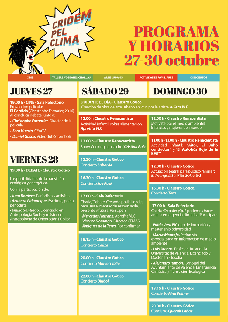 Cridem pel Clima Del 27 al 30 de octubre se celebra el Cridem pel Clima, un festival cultural multidisciplinar donde música y arte se unen para concienciar sobre la crisis climática ¿Cuándo? Fecha Del Thursday, 27 de October del 2022 al Sunday, 30 de October del 2022 HORA 12:00 h ¿Dónde? LUGAR Centre del Carme C/ Museu, 2 Ver ficha La segunda edición del festival Cridem pel Clima se celebra del 27 al 30 de octubre en el Centre del Carme. Habrá actividades culturales y encuentros con expertos, para todas las edades y niveles de sensibilización. Consulta más eventos en la agenda de València. Durante cuatro días, el CCCC se convertirá en un escenario lúdico y cultural, de diálogo entre expertos en la emergencia climática y la cultura, con espacio para la participación ciudadana. Será un espacio para reflexionar, disfrutar y conocer alternativas posibles frente a retos ambientales. Un espacio para conocer vías de creación de una ciudad más resiliente contra el cambio climático. Cridem pel Clima 2022 contará con conciertos, debates, charlas, talleres y mesas redondas. Además también habrá actividades infantiles para que los niños y niñas se diviertan aprendiendo. Un evento gratuito para todos. Programación Cridem pel Clima 2022 Jueves 27 de octubre A las 19:00 horas, proyección ‘El Perdido’ (Christophe Farnarier, 2016). Al concluir debate con la participación de: Christophe Farnarier (Director de la película), Sera Huertas (CEACV) y Daniel Gascó (Videoclub Estrómboli). Sala Refectorio. Viernes 28 de octubre A las 19:00 horas, debate ‘Las posibilidades de la transición ecológica y energética’. Con la participación de: Juan Bordera (Periodista y activista), Azahara Palomeque (Escritora, poeta y periodista) y Emilio Santiago (Licenciado en Antropología Social y Máster en Antropología de Orientación Pública). Claustro gótico. Sábado 29 de octubre A las 12:00 horas, actividad infantil sobre alimentación. Aprovecha VLC y Showcooking con la chef Cristina Ruiz. Claustro renacentista. A las 12:30 horas, concierto Laborde. Claustro gótico. A las 16:30 horas, concierto Joe Pask. Claustro gótico. A las 17:00 horas, charla/debate ‘Creando posibilidades para una alimentación responsable, presente y futura’ con la participación de: Mercedes Herranz (Aprovecha VLC), Vicente Domingo (Director CEMAS) y Amigas de la Tierra. Sala Refectorio. A las 18:15 horas, concierto Caliza. Claustro gótico. A las 20:00 horas, concierto Marcel i Julia. Claustro gótico. A las 22:00 horas, concierto Bluboi. Claustro gótico. Domingo 30 de octubre De 11:00 a 13:00 horas, actividad infantil ‘Aitor, El Búho conductor’ y ‘ El Autobús Rojo de la EMT’. Claustro renacentista. A las 12:00 horas, ‘¡Actívate por el medio ambiente! Infancias y mujeres del mundo’. Claustro renacentista. A las 12:30 horas, actuación teatral para público familiar ‘El Triangulista. Plástico-tic-tic!’. Claustro gótico. A las 16:30 horas, concierto Tesa. Claustro gótico. A las 17:00 horas, charla/debate ‘¿Qué podemos hacer ante la emergencia climática?’ con la participación de Pablo Vera (Biólógo de formación y Máster en biodiversidad), Marta Montojo (Periodista especializada en información de medio ambiente), Luis Arenas (Profesor titular de la Universitat de València. Licenciado y Doctor en Filosofía) y Alejandro Ramón (Regidor del Ayuntamiento de València. Emergencia Climática y Transición Ecológica). Sala Refectorio. A las 18:15 horas, concierto Aina Palmer. Claustro gótico. A las 20:00 horas, concierto Queralt Lahoz. Claustro gótico. Además durante el fin de semana, los días 29 y 30 de octubre, tendrá lugar la creación de una obra de arte urbano en vivo por la artista Julieta XLF en el Claustro gótico del Centre del Carme. Artículos relacionados El Flea Market de València – Especial ‘Todo a un euro’ MarisGalicia en Valencia ‘Cluedo’ en vivo en València InfinitaMente, exposición de Jaime Hayon en Valencia