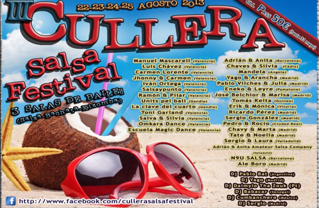 Cullera Salsa Festival 2013 El Cullera Salsa Festival tendrá lugar del 22 al 25 de agosto ¿Cuándo? Fecha Del Thursday, 22 de August del 2013 al Sunday, 25 de August del 2013 HORA 00:00 h ¿Dónde? LUGAR Cullera parking Enrique Chulio Ver ficha Llega con todo el ritmo la 3º edición del Cullera Salsa Festival. Del 22 al 25 de agosto, cuatro noches de fiesta en las que la música alcanzará una dimensión especial. Celebrado en el Hotel Holiday de Cullera, el festival dispondrá de tres salas; salsa, bachata y kizomba. Así podrás elegir el ritmo que más te pida el cuerpo. El Cullera Salsa Festival se celebra, además, a escasos 100 metros de la playa. Y para hospedarte durante el festival puedes elegir entre el hotel donde tiene lugar la explosión de música latina más grande del año, o en un camping cercano. Además la localidad de Cullera dispone de muchas opciones para disfrutar del verano. Como novedad, esta edición cuenta además con actividades de baile que tendrán lugar a partir del 19 de agosto, por si llegas un poco antes al evento de la música latina. El Cullera Salsa Festival incluye también talleres, shows, y otras actividades, todas ellas relacionadas con la música y el baile. Artículos relacionados Conciertos Valencia Agosto 2013 Monólogos Valencia Programación Filmoteca d’Estiu Valencia 2013