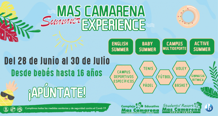 Cursos de verano Mas Camarena El Complejo Educativo Mas Camarena ofrece 10 cursos de verano todos ellos han sido pensados y planificados dentro de las medidas sanitarias y de seguridad contra el COVID. ¿Cuándo? Fecha Del Monday, 28 de June del 2021 al Friday, 30 de July del 2021 HORA 09:00 h ¿Dónde? LUGAR Valencia Valencia Ver ficha “Mas Camarena Summer Experience” cuenta con varios programas adaptados a cada edad con temáticas diferentes, y varios de ellos íntegramente en inglés. Este súper verano empieza el 28 de junio hasta el 30 de julio, con posibilidad de comedor. Una escuela de verano en València ideal para que los niños disfruten. Otro de sus programas estrella son sus “Campus deportivos Específicos” las nuevas zonas deportivas de su Resort dan la posibilidad de perfeccionar tu deporte favorito en las mejores instalaciones y con grandes profesionales del deporte. Dirigido a niños desde los 4 meses hasta los 16 años. Su programa “English Summer” íntegramente en inglés se ha creado para cada edad una temática diferente y adaptada a lo que más les gusta. Podrás ser artista, detective, superhéroe, actor de cine, viajero en el tiempo, cantante… Están pensados para que los niños descubran, investiguen y realicen actividades diferentes cada día. Esta variedad persigue fomentar el interés y la curiosidad a través de experiencias activas. Los grupos son reducidos y por niveles. Cada actividad está creada para entretener y divertir a los niños, pero este año se ha añadido un requisito más que las medidas de seguridad y sanitarias sean también una prioridad en el verano Mas Camarena. Para los más pequeños desde 4 meses hasta 3 años tiene preparado un curso exclusivo, con especialistas de Infantil, su “Baby Summer” es un momento ideal para iniciar a los pequeños en el cole. Consiguiendo una adaptación progresiva para el inicio en septiembre. Un curso divertido con sesiones de inglés, juegos dirigidos, cuenta cuentos, estimulación multisensorial, música, marionetas…y por supuesto una mini piscina, para tener un verano muy refrescante. Este curso cuenta con 2 profesores por aula para que los más peques reciban una atención personalizada. Campus multideporte Mas Camarena reúne todas las condiciones para realizar uno de los campus deportivos más completos de Valencia. Se planifica para que cada día sea diferente, unos días se realizarán actividades multideporte en el centro deportivo del colegio, harán baloncesto, pádel, tenis, fútbol, hockey, judo, futsala… y dos días se irán al Resort Mas Camarena para practicar fútbol y atletismo. El deporte para Mas Camarena es mucho más, por eso contaremos con visitas de deportistas de élite que vendrán a pasar una mañana para explicarnos los valores y habilidades que transmiten la realización de cualquier actividad física. Y para que sean aún más completo le sumamos clases se inglés. Dos de sus programas de se realizan en Mas Camarena Students’ Resort and Sports Centre. Actívate con el programa “ActivaSummer” dirigido a jóvenes de entre 12 y 16 años. Está diseñado para abarcar actividades culturales, deportivas y tecnológicas en unas instalaciones inmejorables. Hockey, Balonmano, Bádminton, Vóley, Fútbol, Basket, paddel surf… Talleres medioambientales, cine fórum, teatro, speech, primeros auxilios… Arte digital y fotografía, E-games, música digital, teambuilding, scaperoom… Perfecciona tu deporte favorito Pero si tu pasión son los deportes y quieres perfeccionarlos este verano han preparado 6 campus específicos de tenis, pádel, fútbol, vóley, basket y gimnasia rítmica. En los que podrás perfeccionar tu técnica, conocer nuevos estilos, trabajar en equipo y todo en las mejores instalaciones deportivas y de la mano de grandes profesionales deportivos. Además las instalaciones recién inauguradas sus 6 pistas de tenis de tierra batida, 2 pistas rápidas y 6 pistas de pádel, más sus 3 canchas de baloncesto cubiertas cuentan con todo lo necesario para la práctica del deporte. Además en estos campus tienen preparado sorpresas muy refrescantes para todos los jóvenes deportistas. Todo el material y la línea creativa de cada uno de estos cursos está diseñada por el profesorado Mas Camarena. La diversión va guiada por profesores bilingües que crearán un ambiente donde priman los valores de compañerismo, amistad y convivencia sean prioridad. Mas Camarena también cuenta con un protocolo con todas las medidas sanitarias y de seguridad contra el COVID, creando unos espacios seguros para cada programa.