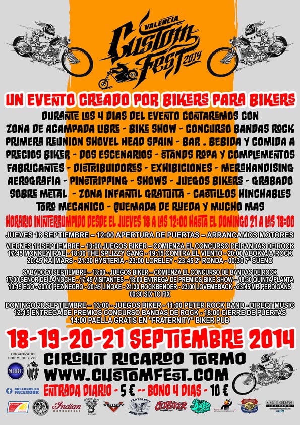 Se celebra en Cheste (Valencia) el CustomFest 2014 del 18 al 21 de septiembre. Se trata de la segunda edición de este evento para los amantes de la Cultura Custom, que se celebra en el Circuit de la Comunitat Valenciana Ricardo Tormo.