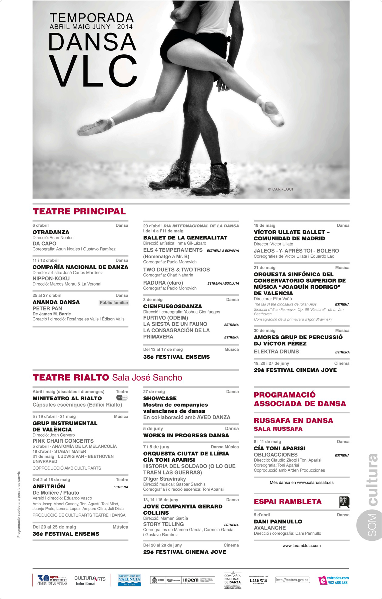 Dansa València 2014 La danza se adueña de la primavera valenciana ¿Cuándo? Fecha Del Tuesday, 01 de April del 2014 al Monday, 30 de June del 2014 HORA 00:00 h ¿Dónde? LUGAR Valencia Valencia Ver ficha La danza será la protagonista de esta primavera en Valencia. El Festival Dansa València 2014, acogerá en los teatros de la ciudad, desde el mes de abril al mes de junio; hasta doce espectáculos de danza, de los que formarán parte las compañías valencianas y nacionales más destacadas. Los teatros que participan en esta iniciativa son: El Teatro Principal, el Rialto, el Carme, La Rambleta y Russafa. Tras las peticiones de coreógrafos y bailarines el Festival Dansa Valencia 2014 retoma sus orígenes y se convierte en un escaparate de los profesionales de la danza en Valencia. Un giro mucho más local que contará con hasta ocho compañías de danza valencianas. El Festival de Danza València 2014, cuenta con la presencia de la Compañía Nacional de Danza (CND), así como el Víctor Ullate Ballet, dos de las compañías de danza más prestigiosas a nivel internacional. También participan: la compañía Ananda Dansa, el Ballet de Teatres de la Generalitat, Cienfuegos Danza, la compañía de Toni Aparisi o la Jove Gerard Collins, destacados entre los ballets valencianos. El presupuesto aportado por CulturArts a la programación del Festival Dansa Valencia 2014, ronda los 100.000 euros, al margen del coste del Ballet de la Generalitat. PROGRAMACIÓN DANSA VALENCIA 2014 * Consulta todos los eventos de Valencia . Artículos relacionados Primavera en Valencia