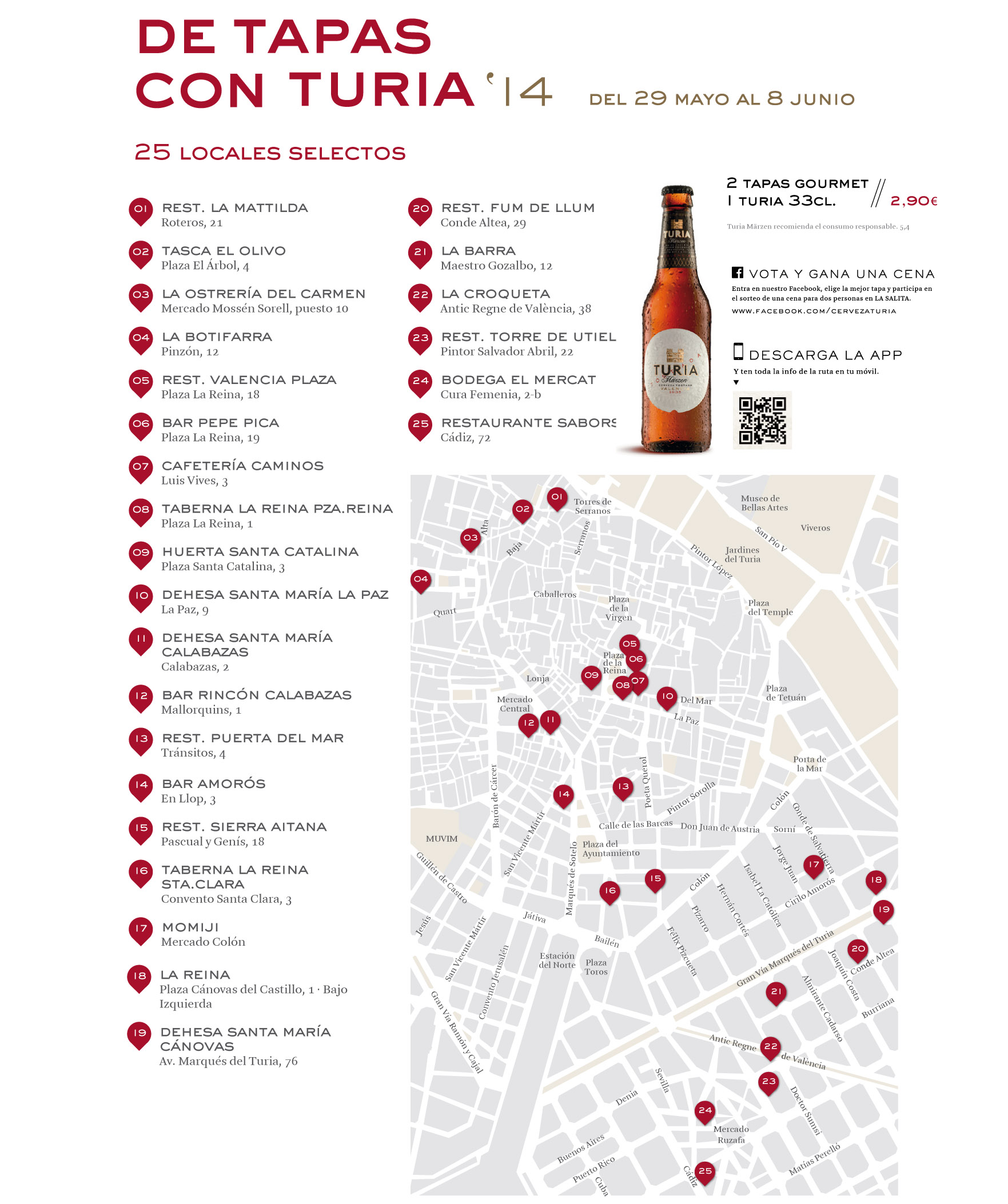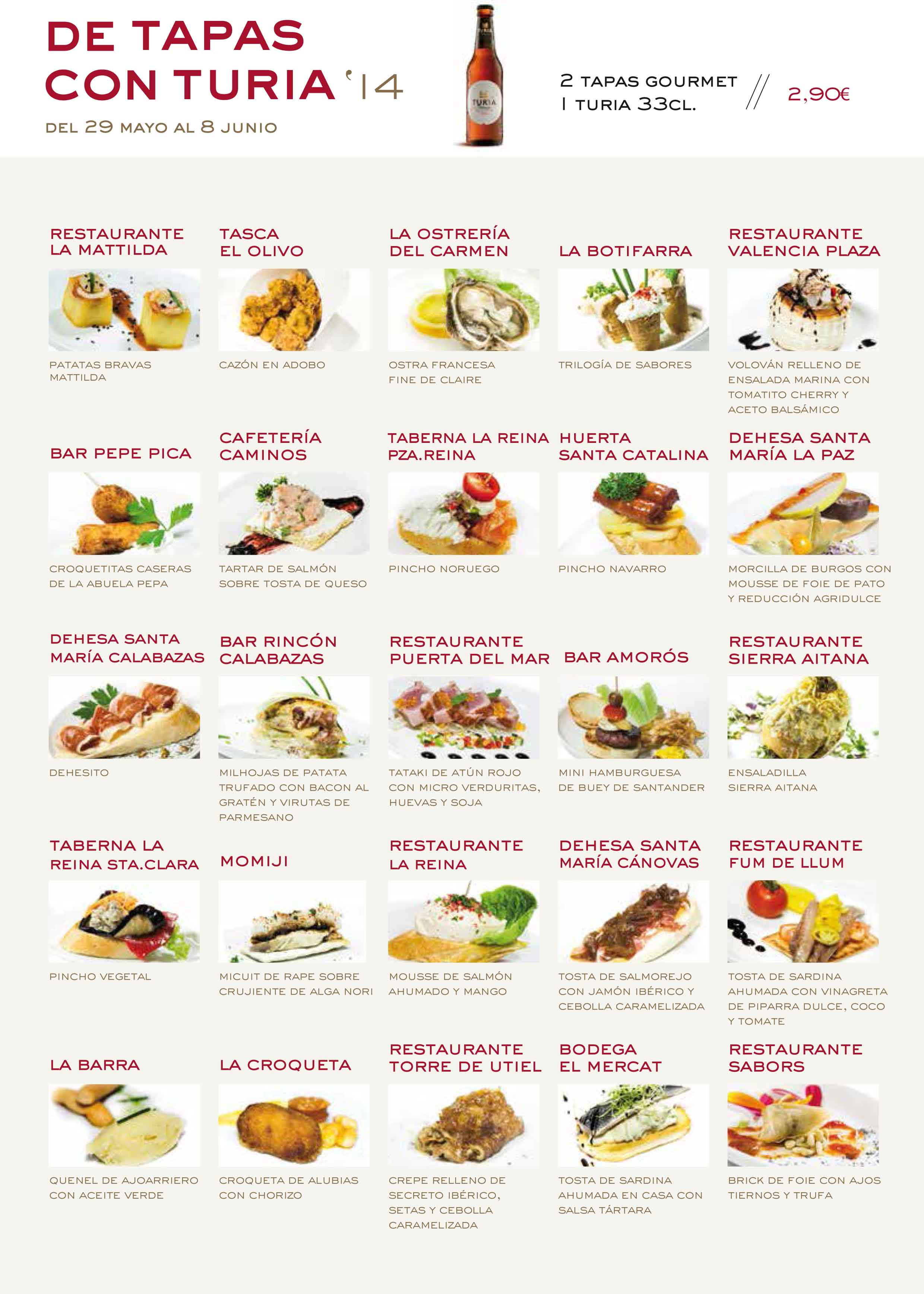 De tapas con Turia 2014 25 restaurantes de Valencia participan en la nueva ruta "De Tapas con Turia" ¿Cuándo? Fecha Del Thursday, 29 de May del 2014 al Sunday, 08 de June del 2014 HORA 12:02 h ¿Dónde? LUGAR Valencia Valencia Ver ficha Valencia celebra “De tapas con Turia“desde el 29 de mayo hasta el 8 de junio, en la que los participantes podrán degustas dos tapas gourmet y una cerveza Turia por 2, 90 euros. Se trata de una ruta gastronómica, llena de sabores y tapas exquisitas, maridadas con la resurgida cerveza tostada Turia. Este año, la ruta de la tapa cuenta con la participación de 25 establecimientos repartidos por algunos de los barrios más emblemáticos de la ciudad como Russafa, L’Eixample o Ciutat Vella. Un paseo a través de la gastronomía valenciana que permitirá degustar en cada uno de estos locales dos tapas gourmet elaboradas especialmente para esta ocasión acompañadas por un tercio de Turia a un precio de 2,90 euros. En esta segunda edición “De Tapas con Turia”, de entre todos los participantes se sorteará una cena para dos personas en el reconocido Restaurante La Salita by Begoña Rodrigo. Además, se volverá a contar con un jurado profesional, vinculado al mundo de la gastronomía, que se encargará de seleccionar la ‘Tapa Gourmet’ de entre las 50 tapas participantes. También está disponible para todos los consumidores una aplicación gratuita que permite llevar en el bolsillo la ruta “De Tapas con Turia’14“, con toda la información sobre los establecimientos participantes y las tapas que ofrecen. Tapas 2014 Locales que participan *Disfruta de la gastronomía de Valencia. Artículos relacionados Gastronomía de Valencia Restaurantes en València Eventos en Valencia