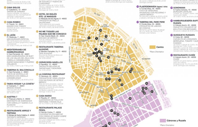 De Tapas por Valencia 2013 De Tapas por Valencia 2013 se celebra en Cánovas, Ruzafa, Paseo de la Malvarrosa y la zona del Palacio de Congresos. ¿Cuándo? Fecha Del Thursday, 17 de October del 2013 al Sunday, 10 de November del 2013 HORA 01:00 h ¿Dónde? LUGAR Valencia Valencia Ver ficha De Tapas por Valencia 2013 celebra su tercera edición. Nuevas zonas se unen al recorrido gastronómico, organizado por la Federación Empresarial de Hostelería de Valencia. Más de 60 bares y restaurantes repartidos en distintas zonas y barrios de la ciudad y muchas muchas tapas para disfrutar de la ciudad y su gastronomía. Restaurantes De Tapas por Valencia Por 2,50 euros podrás disfrutar de tapa y quinto en los diferentes restaurantes que participan en la Ruta de la Tapa. Consulta los locales participantes y las zonas por donde podéis ir De Tapas por Valencia 2013: Ruzafa, Cánovas, el Paseo de la Malvarrosa o la zona del Palacio de Congresos. Zonas De Tapas por Valencia 2013 Consulta la ruta de la tapa Artículos relacionados I Salón Erótico de Valencia 2013 Ruta de la Tapa Valencia 2013 Love of Lesbian en concierto en Valencia 2013