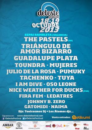 Los grupos confirmados para el cartel del Deleste Festival 2013: Triángulo de Amor Bizarro, Tuya, The Pastels, Guadalupe Plata, Julio de la Rosa, Toundra, Pumuky, Mujeres o Tachenko, entre otros muchos.